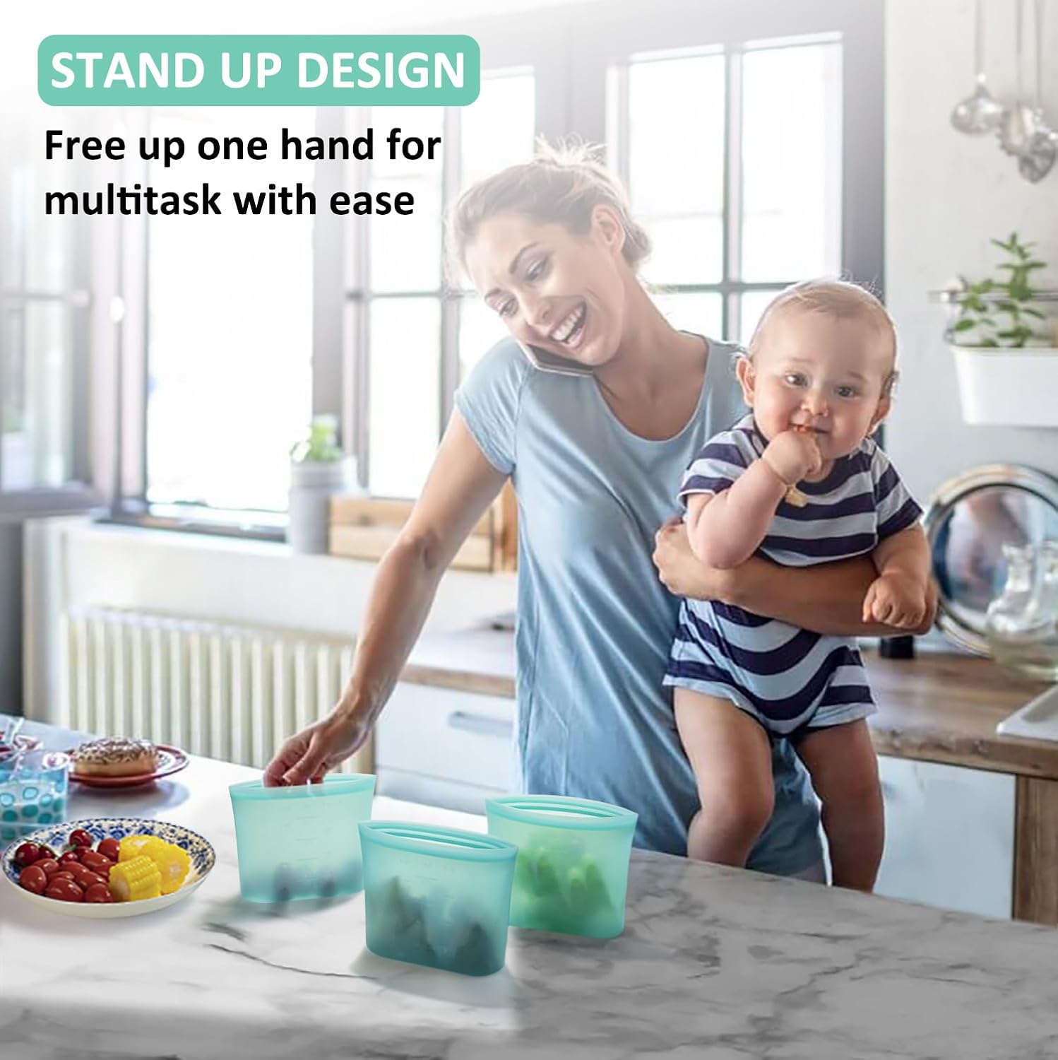 - 【ZIP-LOCK & STAND-UP DESIGN】These reusable silicone bags feature a hassle-free zip-lock closure for effortless opening and closing - no need to worry about losing pesky lids! Their stand-up design allows you to multitask, freeing up one hand to tend to your little one with ease. Plus, flexible material also makes them extremely user-friendly and pressing out air before sealing helps save valuable space
