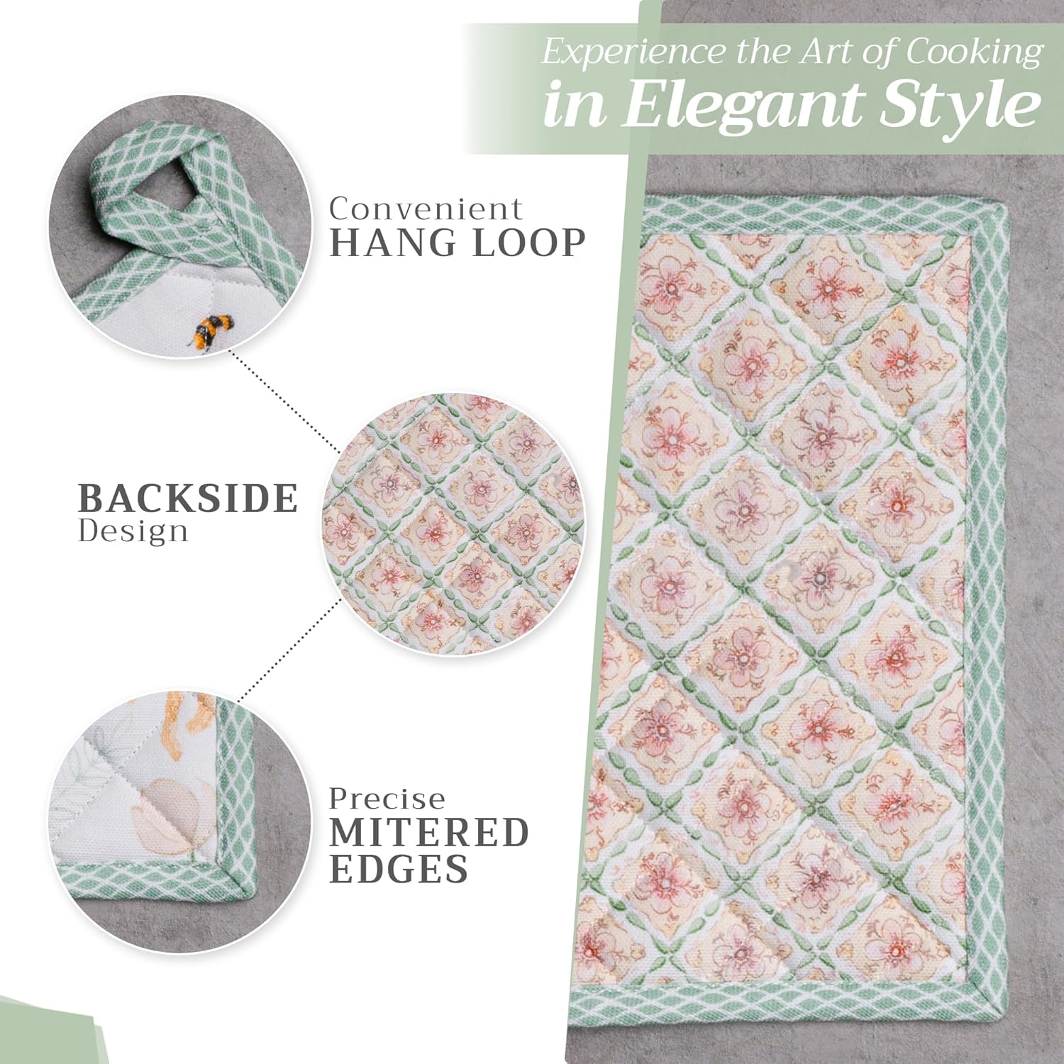 Maison d' Hermine 100% Cotton Oven Mitt & Pot Holder Set (7.5"x13" & 8"x8") Heat Resistant BBQ Cooking Gloves with Loop, Baking, Grilling, Kitchen, Handling Hot Pans Spring/Summer (Easter Dew)