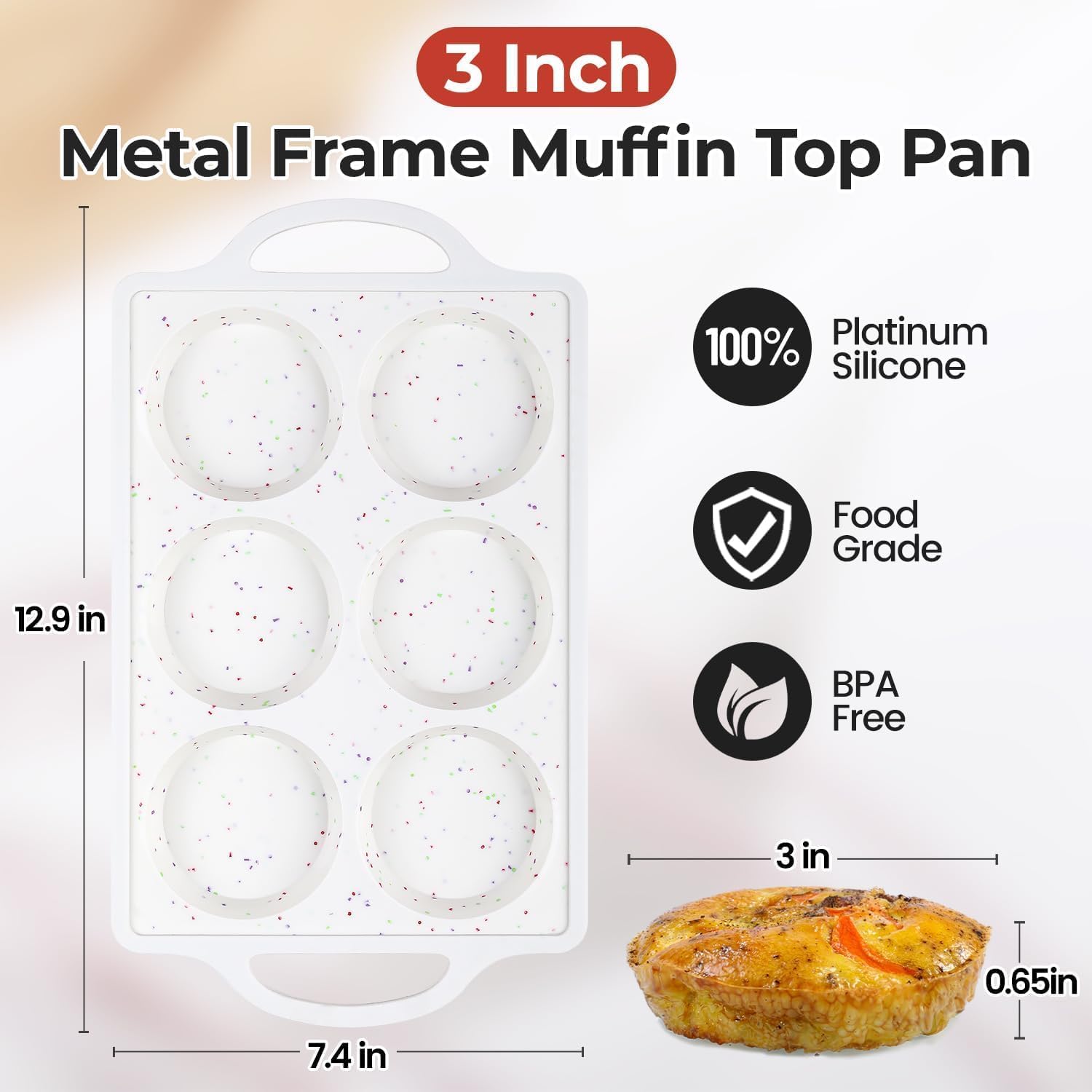- Food Grade Silicone Egg Molds: 100% food grade silicone, Each Cup diameter top: 3 inch, cup depth: 0.65 inch. No more spilling after batter fill in with when transfer muffin top pan from counter to oven