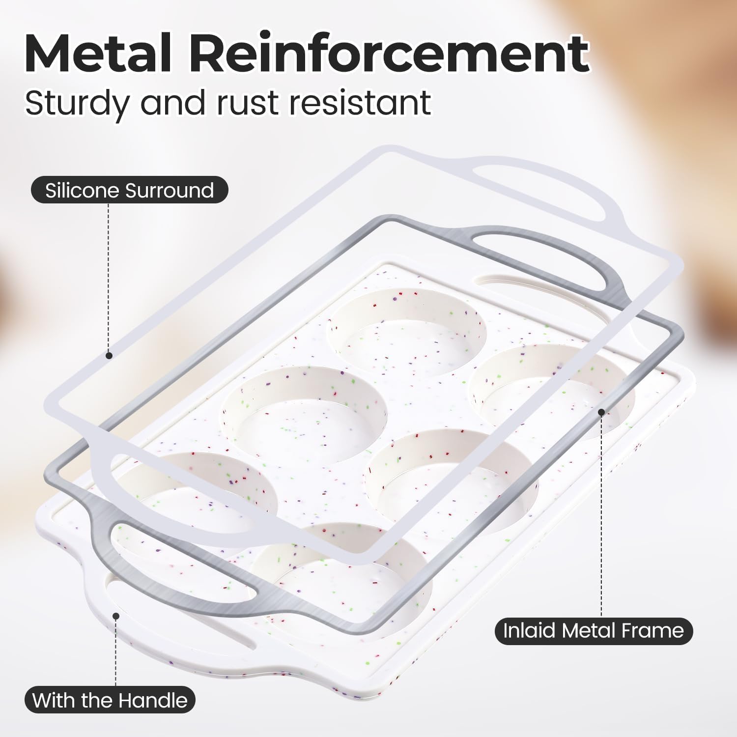 - Metal Reinforced Silicone Muffin Top Pan: The hidden stainless steel frame around the outer edge makes silicone egg molds more sturdy