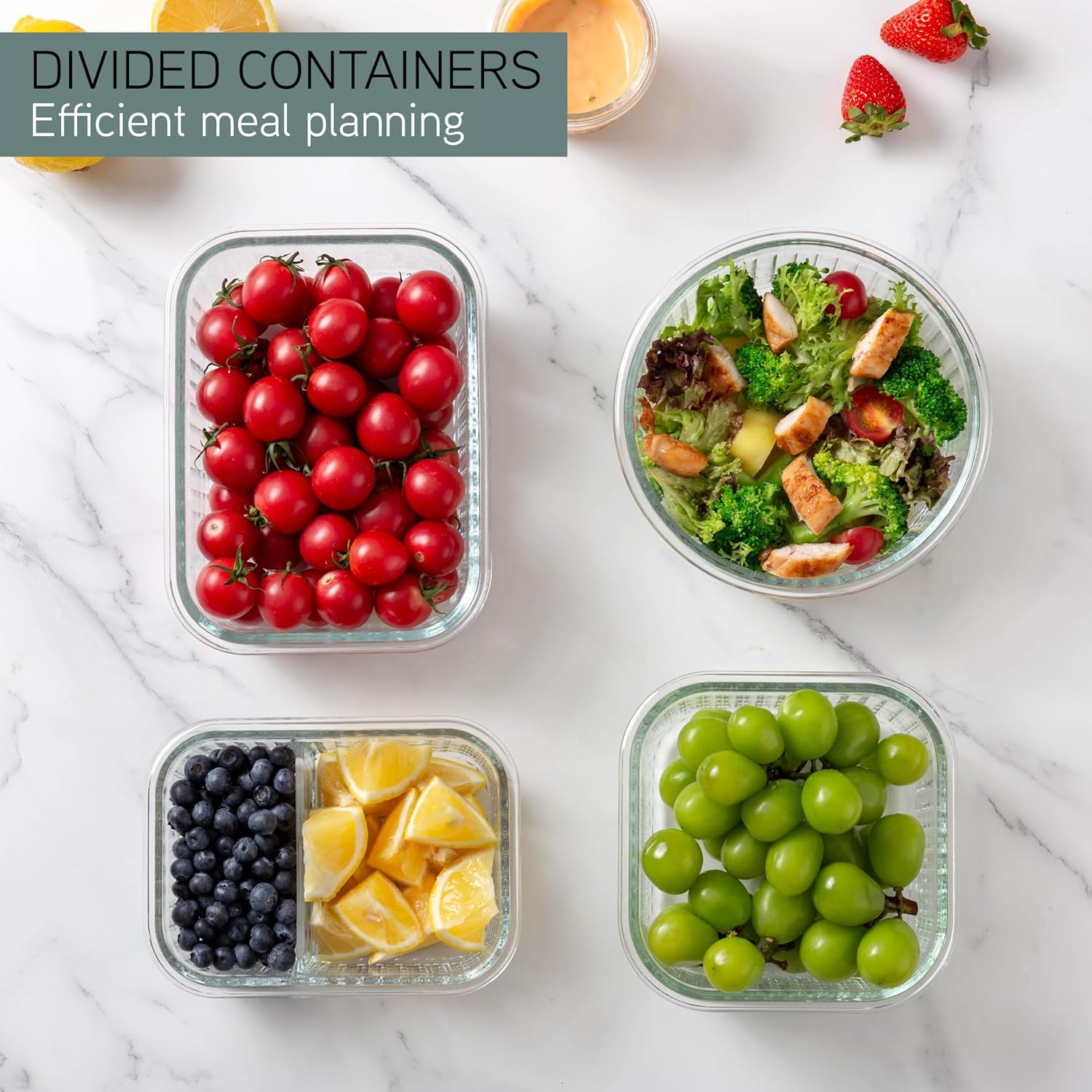 - Innovative Glass Divider Design: Two of the containers feature a built-in glass divider, allowing you to keep different foods separate within the same container, making meal planning and portion control a breeze.