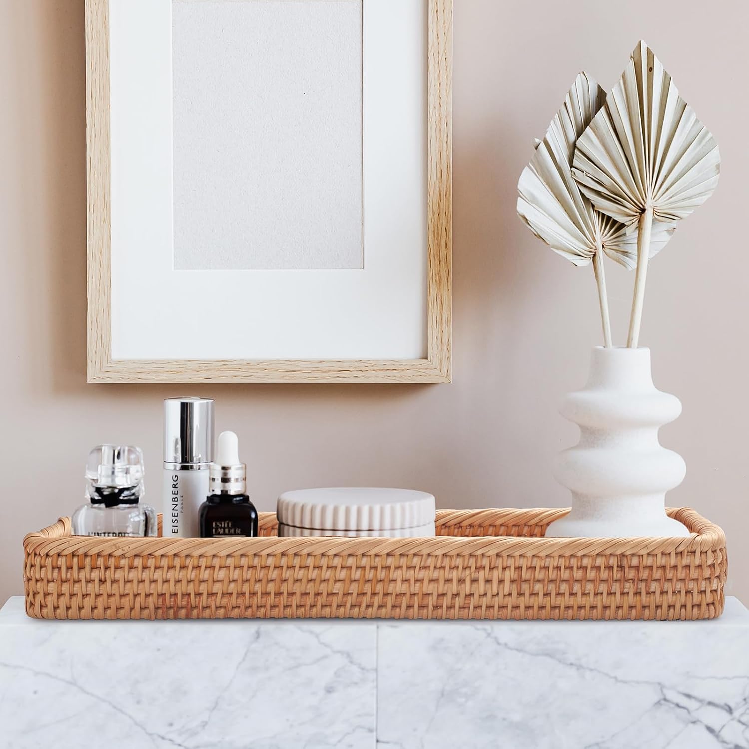 - Multifunctional Tray: The rattan tray can not only be used as bathroom tray to storage toilet paper, tissue, hand towel, candle, wipes, toiletries, perfumes, cosmetics, skincare products, but also can be used as storage basket tray to storage vase, small planter, small decorations, remote control, keys and other small items.