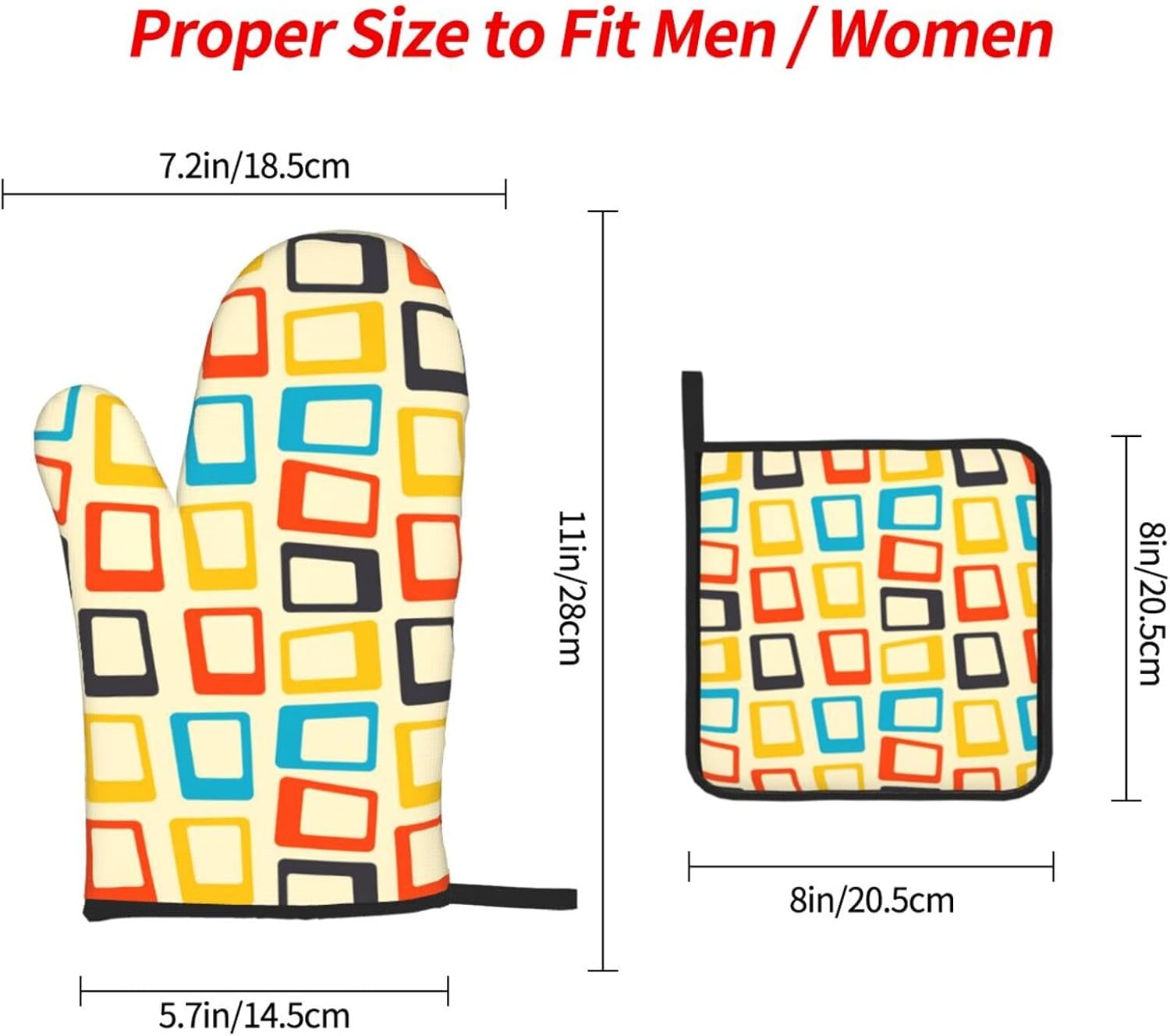 - Size: Kitchen oven gloves measure 7.2 x 11 inch and hot pads measure 8 x 8 inch