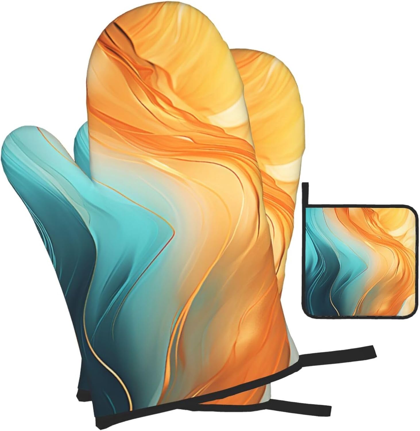 Orange Teal Marble Oven Mitts and Pot Holders Sets of 3 Kitchen Hot Pads Modern Oven Gloves Heat Resistant Washable for Cooking Grilling Baking Holiday Kitchen Decor