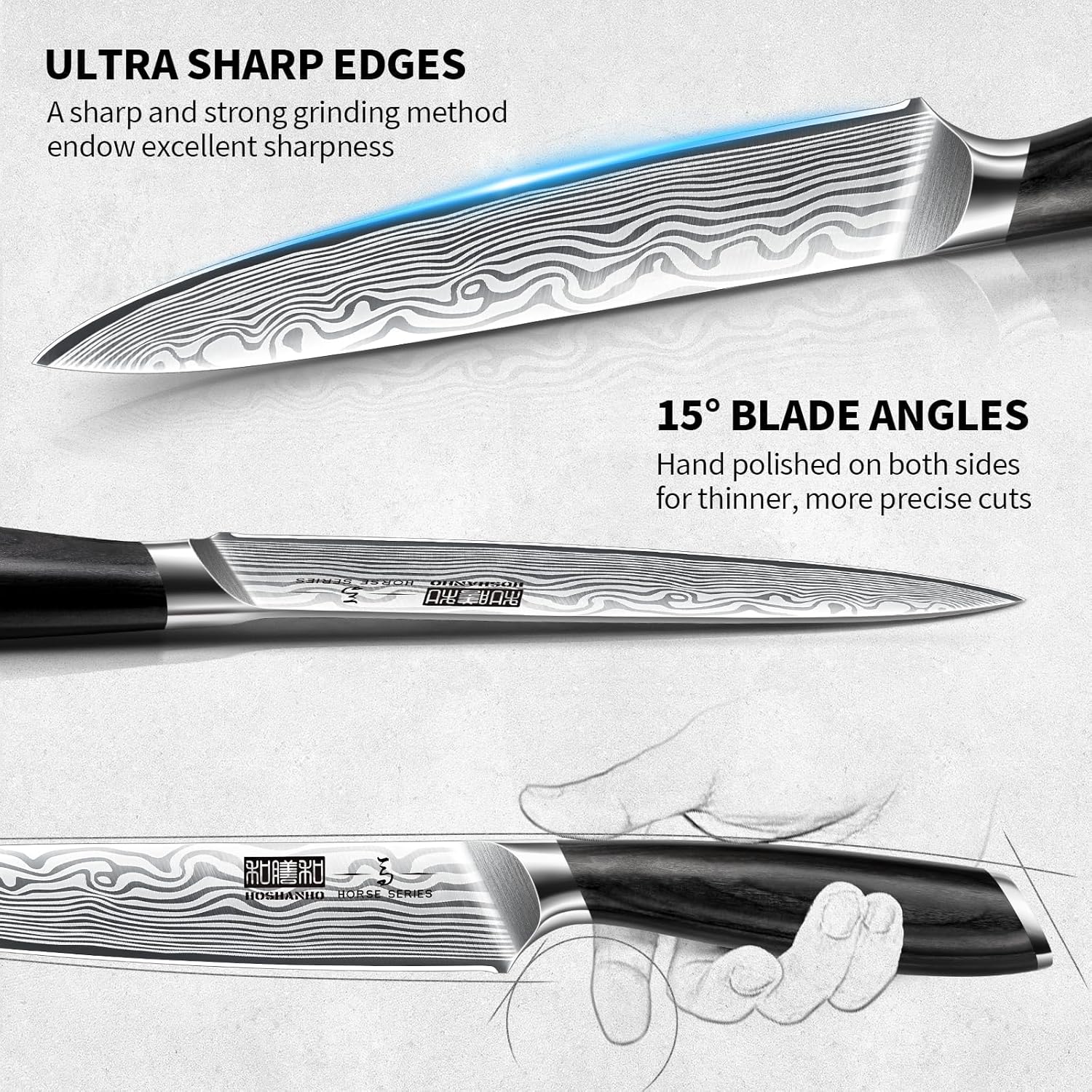 - 【High Carbon Stainless Steel Blades】Made from high carbon stainless steel and powder steel, our knife set has a high degree of hardness to resist wear and is easy to re-sharpen to a razor-like edge; This steel is not ordinary stainless steel, it's stabilized at 62 HRC
