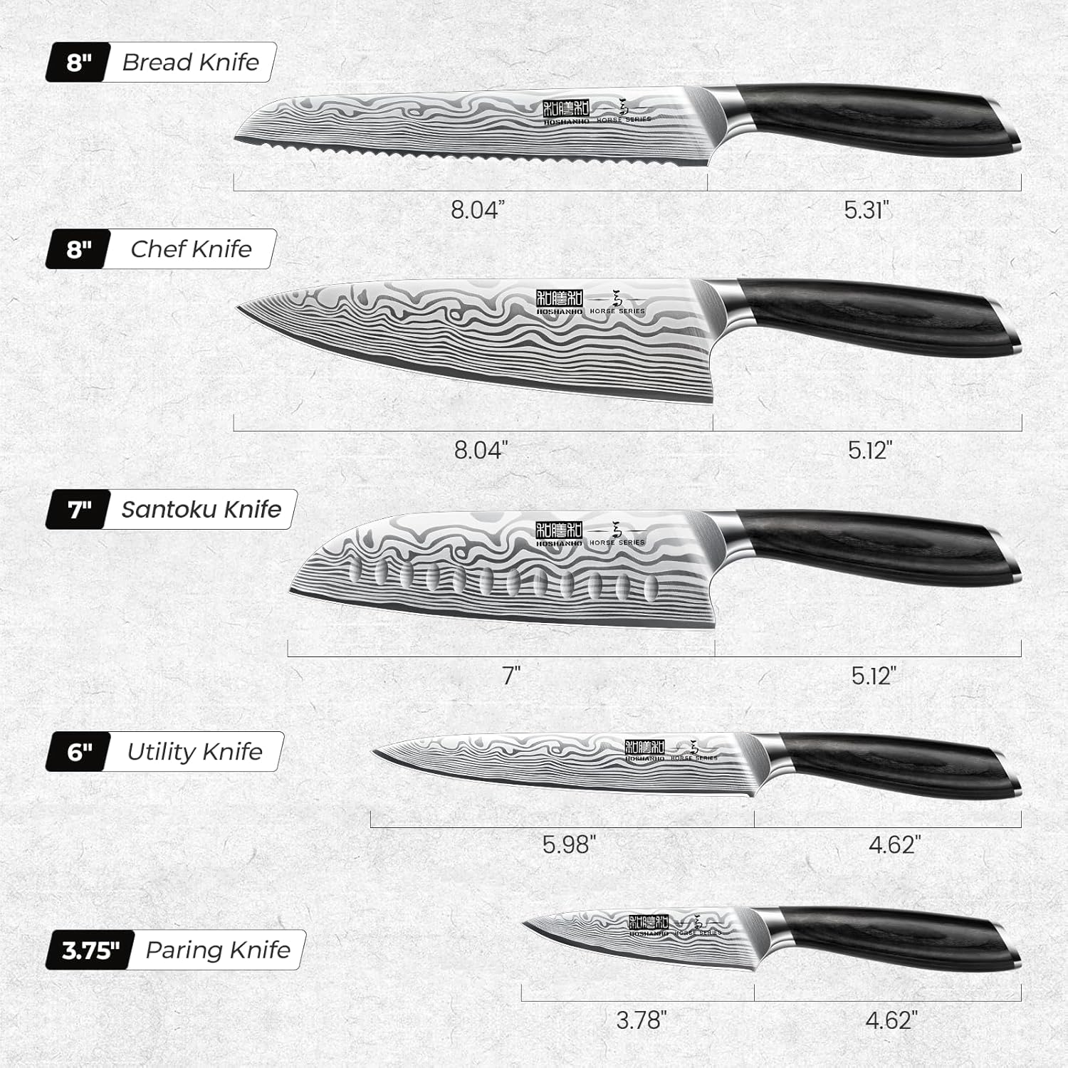 - 【Professional Kitchen Knives Set】5 pieces knife set includes: 8" chef knife, 8" serrated bread knife, 7" santoku knife, 6" utility knife, 3.75" paring knife; This set of knives can easily handle all kitchen tasks, such as cutting meat, fruits, vegetables, and breads