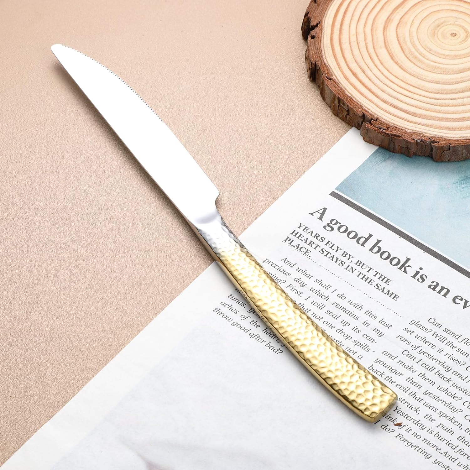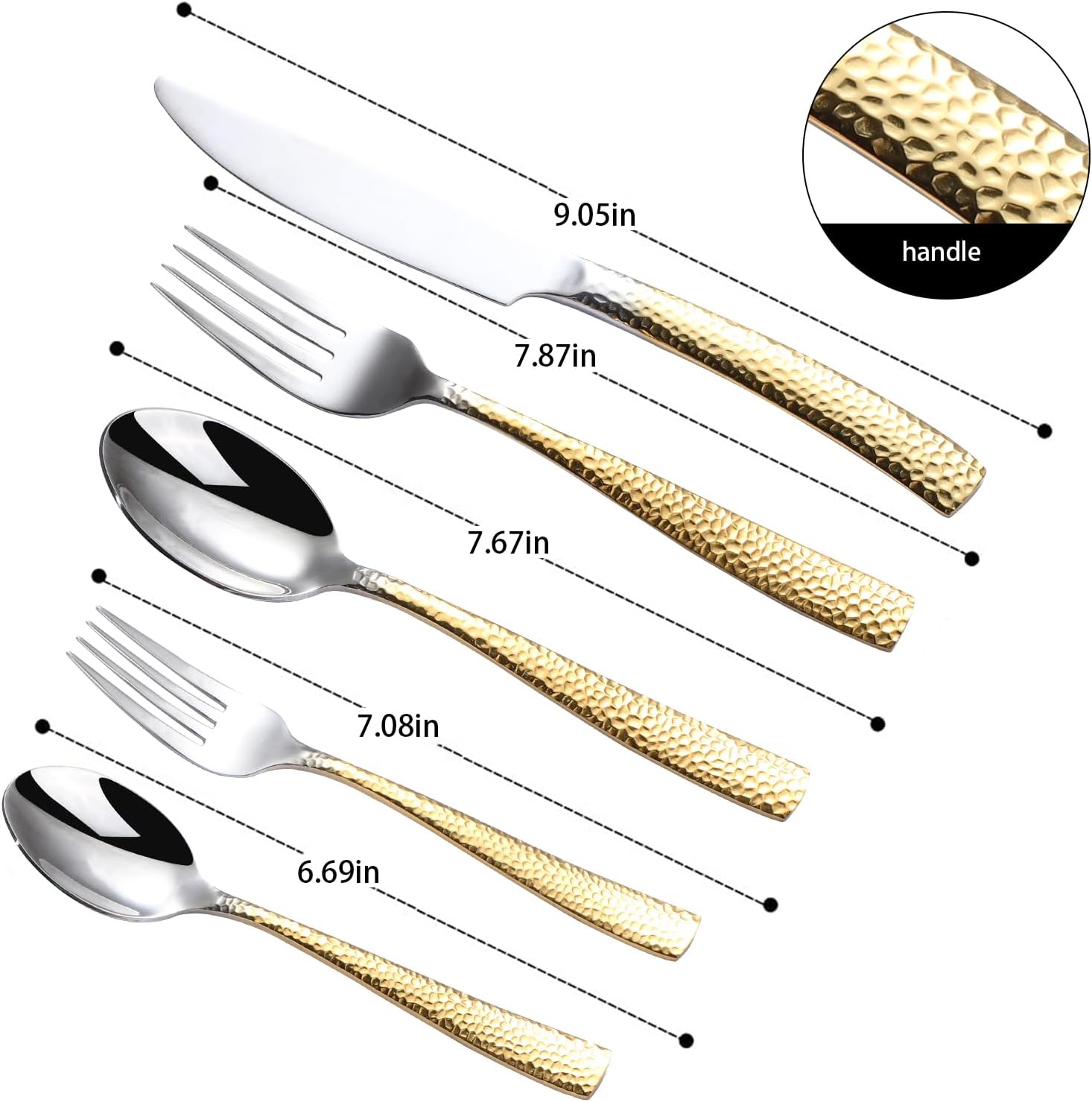 - [Service For 4]:This Hammered 20-Piece Silverware Set Includes 4 Dinner Fork, 4 Dinner Spoons, 4 Dinner Knives,4 Salad Forks,4 Tea Spoons, It Can Satisfy Most Family Of 4 People.