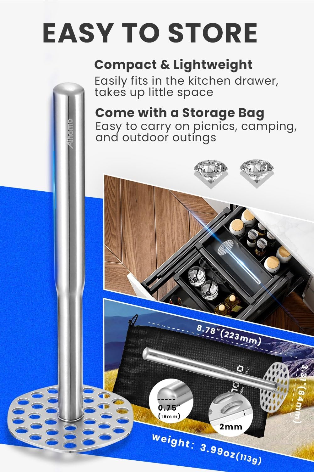 - WONDERFUL GIFT - Aihomo potato mashers are packaged in boxes and come with a long-lasting storage bag, which makes it a wonderful gift for occasions like birthdays, housewarmings, etc., and is meaningful for dads, moms, and friends