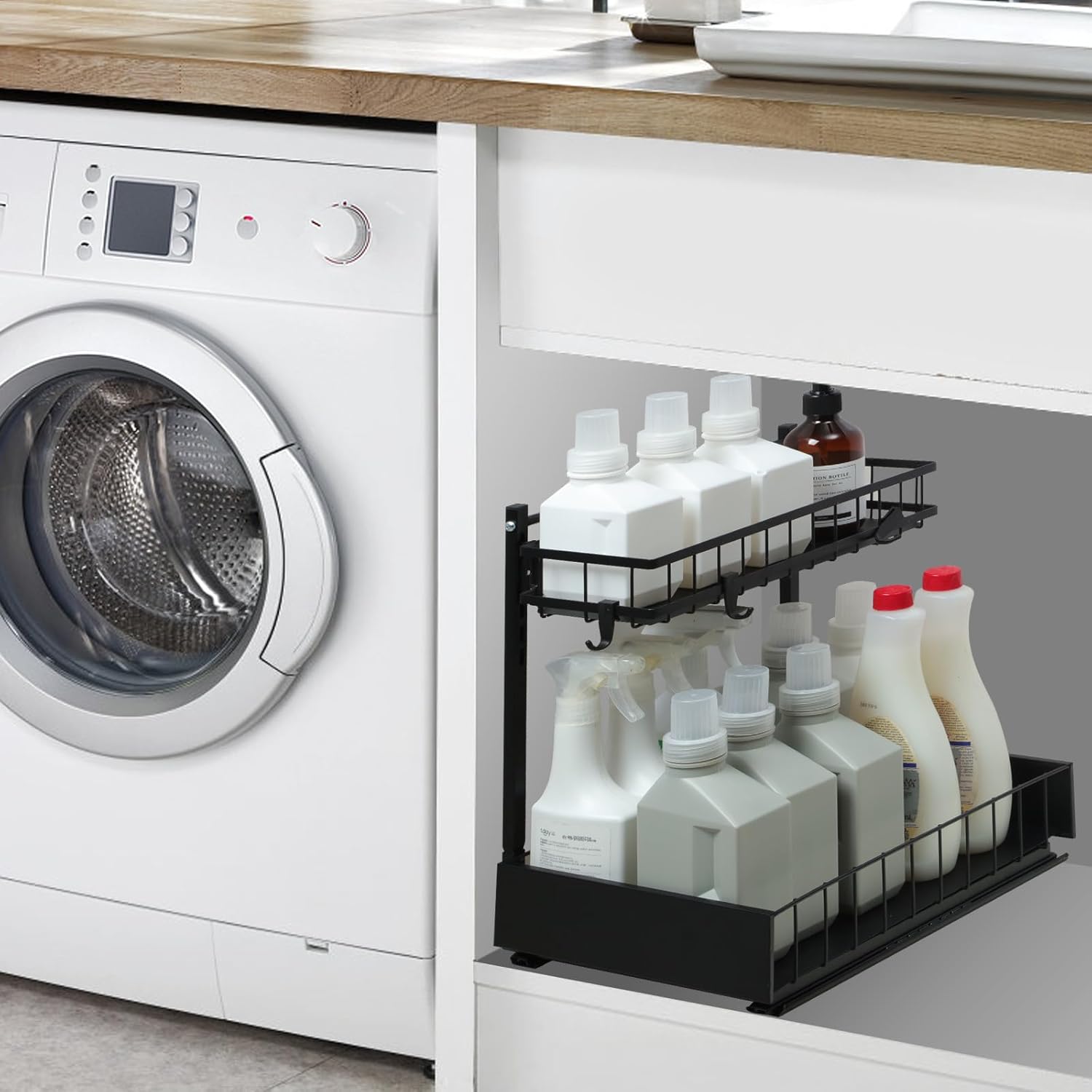 - Large capacity & Application scenario:The under cabinet organizer has larger dimensions,with a top basket size of 2.7Γ5Γ13 inches and a bottom basket size of 3Γ10Γ14 inches.The bottom basket can accommodate items up to a height of 11.5 inches,meeting the needs of most bathrooms and kitchens and allowing for storage of toiletries and kitchen spices, among other items.