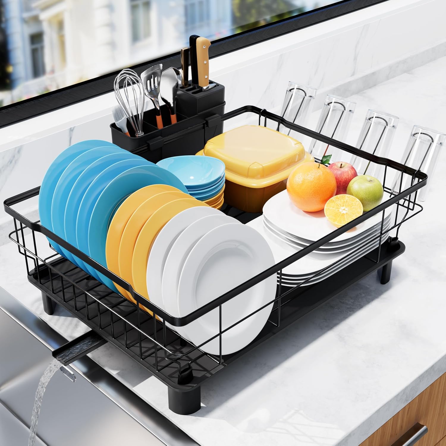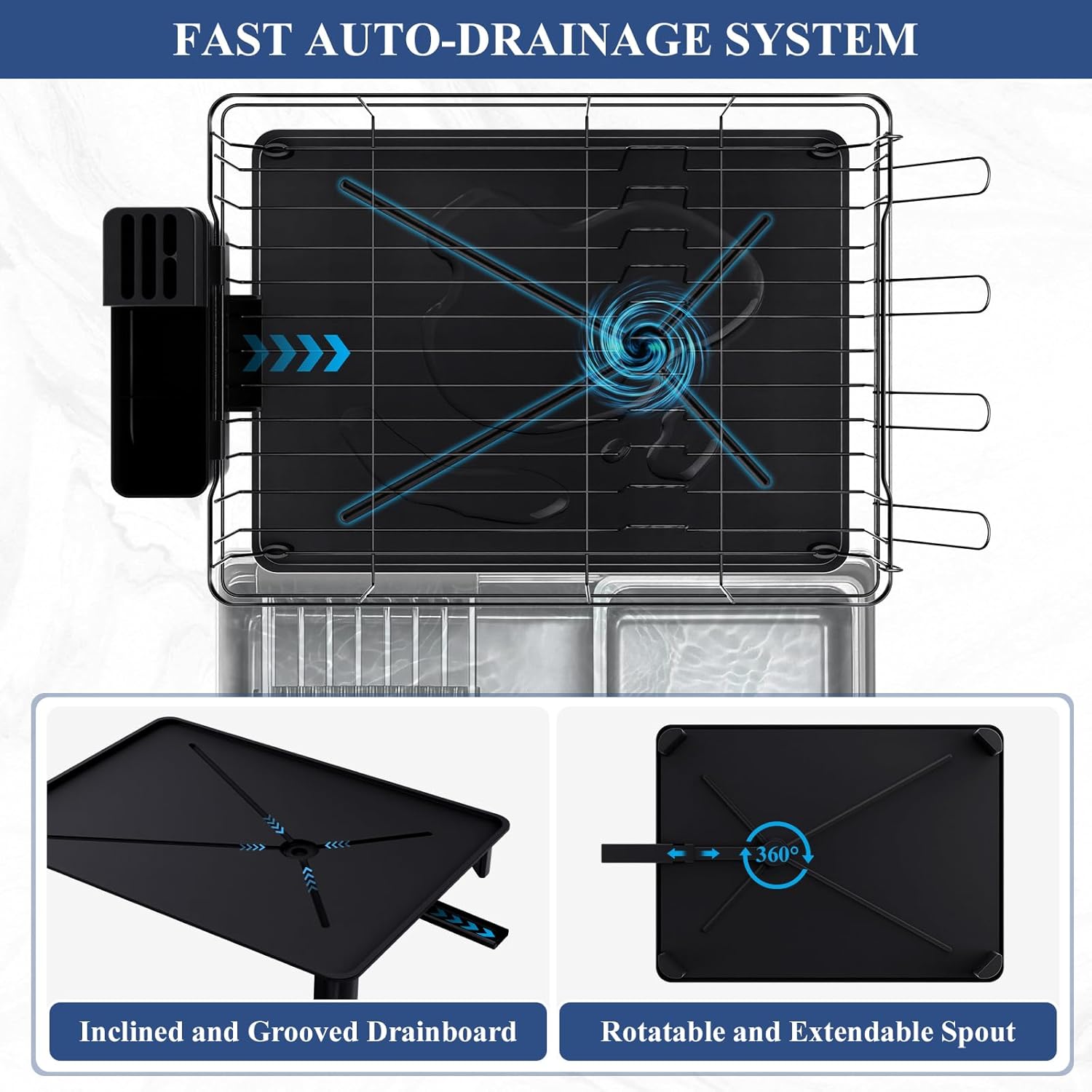 - FAST AUTO-DRAINAGE: The dish drying rack features a slanted drainboard with a central hole and piston, along with grooved channels for efficient and rapid drainage. Itβs also equipped with an extendable and 360Β° rotatable spout allowing it to perfectly fit different kitchen sink