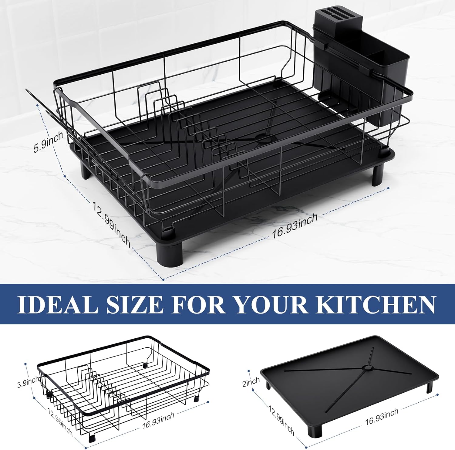 - LARGE CAPACITY: The Homaxy dish drying rack measures 16.93''L x 12.99''W x 5.9''H. It can hold over 10 plates, 4 cups, bowls, cutlery and other kitchenware. Comes with a large utensil holder with three slots and a knife block for partition storage of knives and forks
