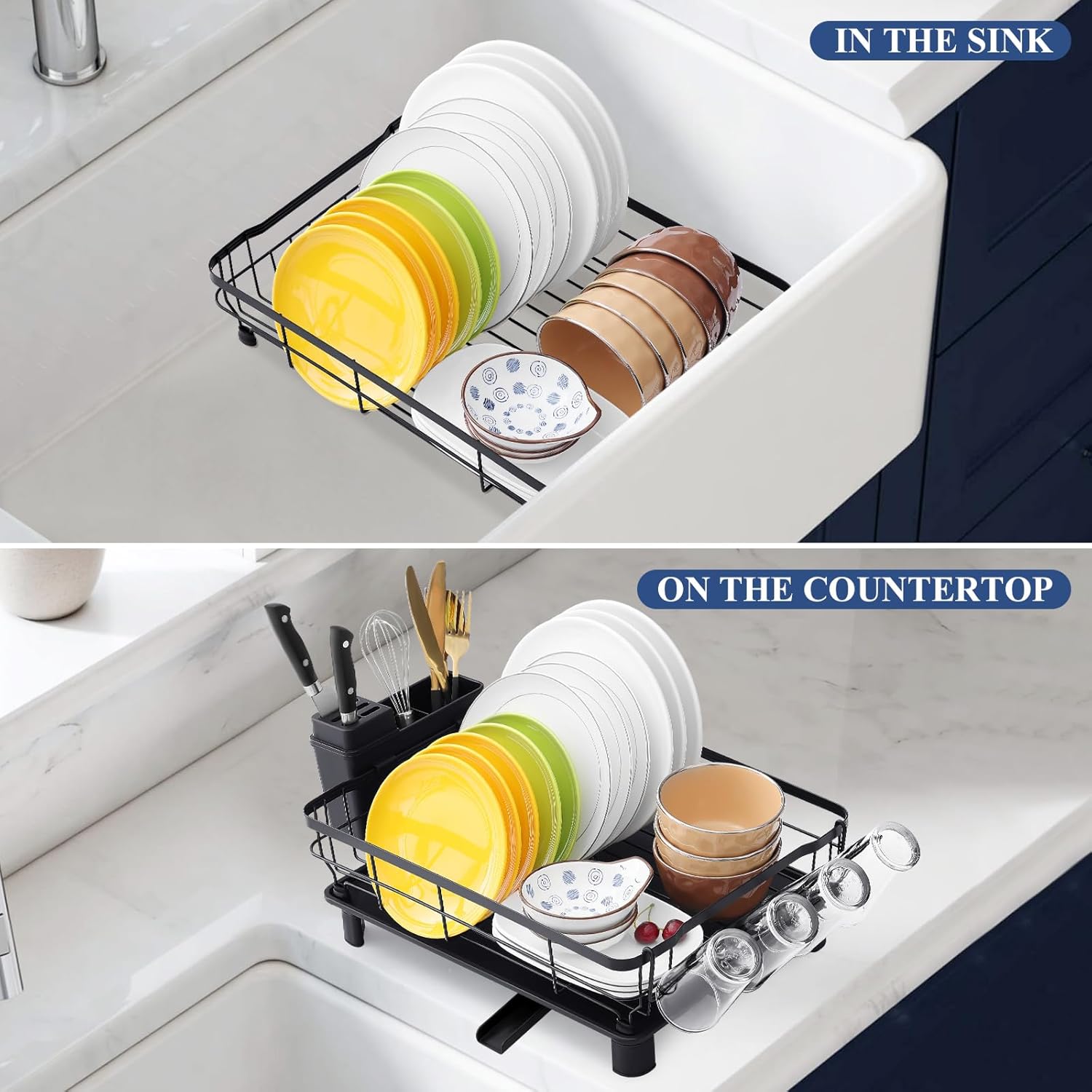 - MULTIFUNCTIONAL STORAGE: Comprise a dish rack, a utensil holder with knife block, a cup rack, and drainboard set. This dish rack can efficiently organize your various tableware and save kitchen space. Also you can put the rack in the sink or use the drainage board to put the dish rack on the counter. Keep your countertop tidy and dry