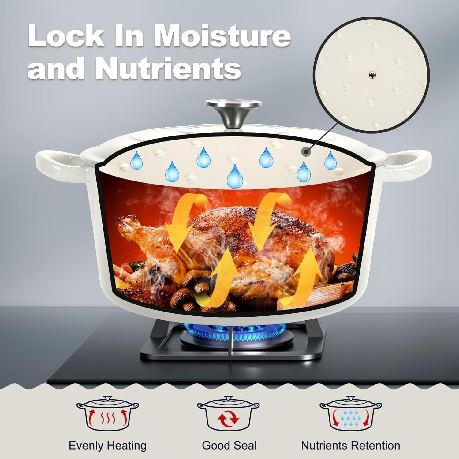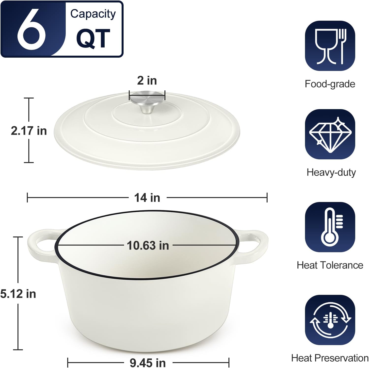 - 【Considerate Designs】Our cast Iron dutch oven comes with thickened EPE foam & carton double packing, Protect your dutch oven roundly in delivery, Ergonomic lid handle provides comfortable holding, Wide sturdy one-piece handles ensure a firm grasp, No worries about handles falling apart, Beautiful white color well fit different kitchen styles