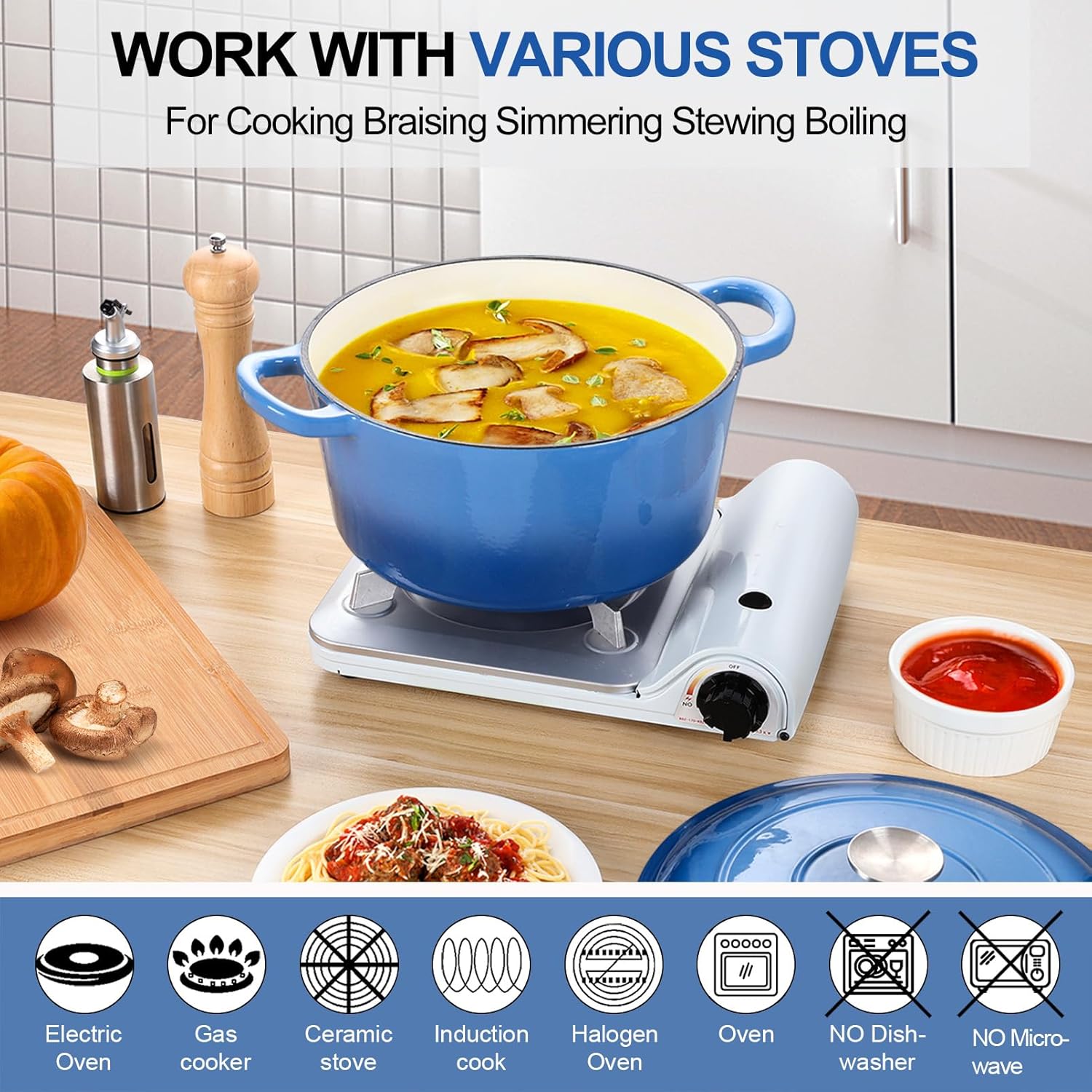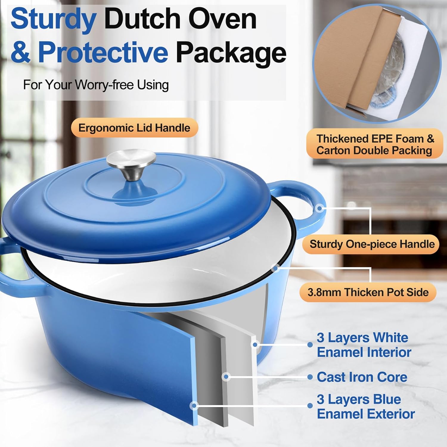 - 【Thoughtful Designs】Our dutch oven pot with lid comes with double packing of thickened EPE foam & carton, Protect your dutch oven roundly in delivery, Matching cast iron lid with exquisite stainless steel knob provide comfortable holding, Double wide sturdy one-piece handles ensure a secure grasp, No worries about handles falling apart, And easy to carry more food, Bright blue color will brighten up your kitchen and fit well with various kitchen styles