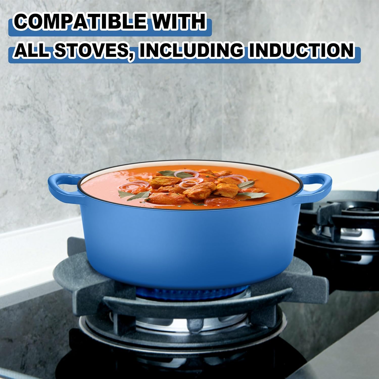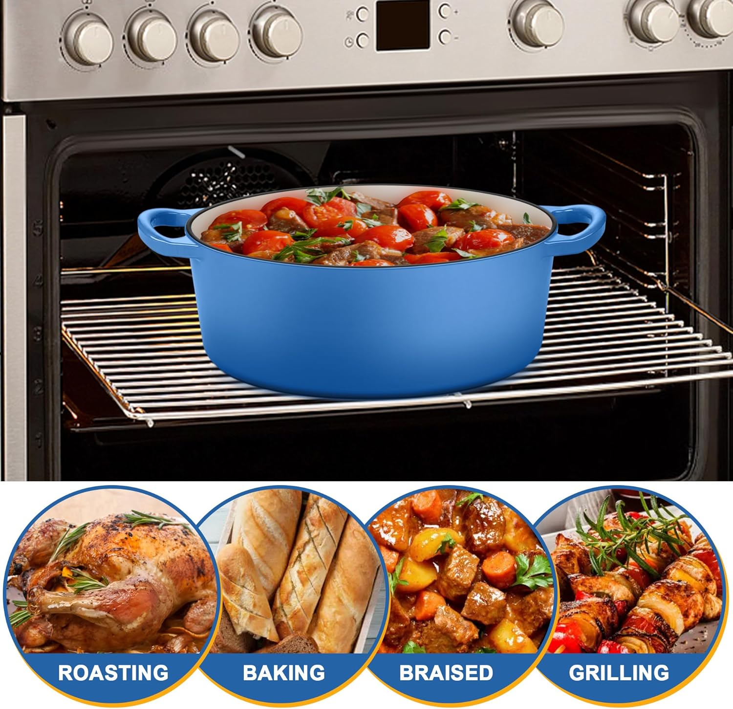 - PERFECT SIZE & MULTI PURPOSE: Oval shape with 5qt ample size perfect for a full sized chicken or oblong sourdough loaf, Go nicely from oven for baking artisan bread/casserole to stove top for soup/stews, Or directly to table for serving with its rustic blue look, Versatile for broiling, braising, frying, sauteing