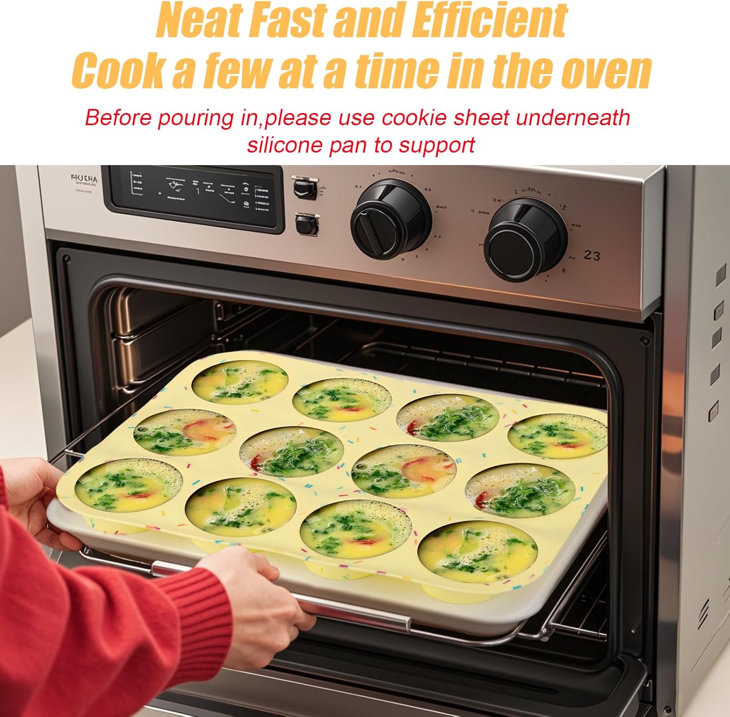 - 12-Cavity Egg Bite Silicone Mold : This 12-cavity egg bite silicone mold stands out for its quick and efficient production ability, which not only serves breakfast for the whole family, but also shines at weddings, company parties, and other occasions, providing guests with a delicious egg bite breakfast. Whether it's a family dinner or a social event, it's your indispensable kitchen helper