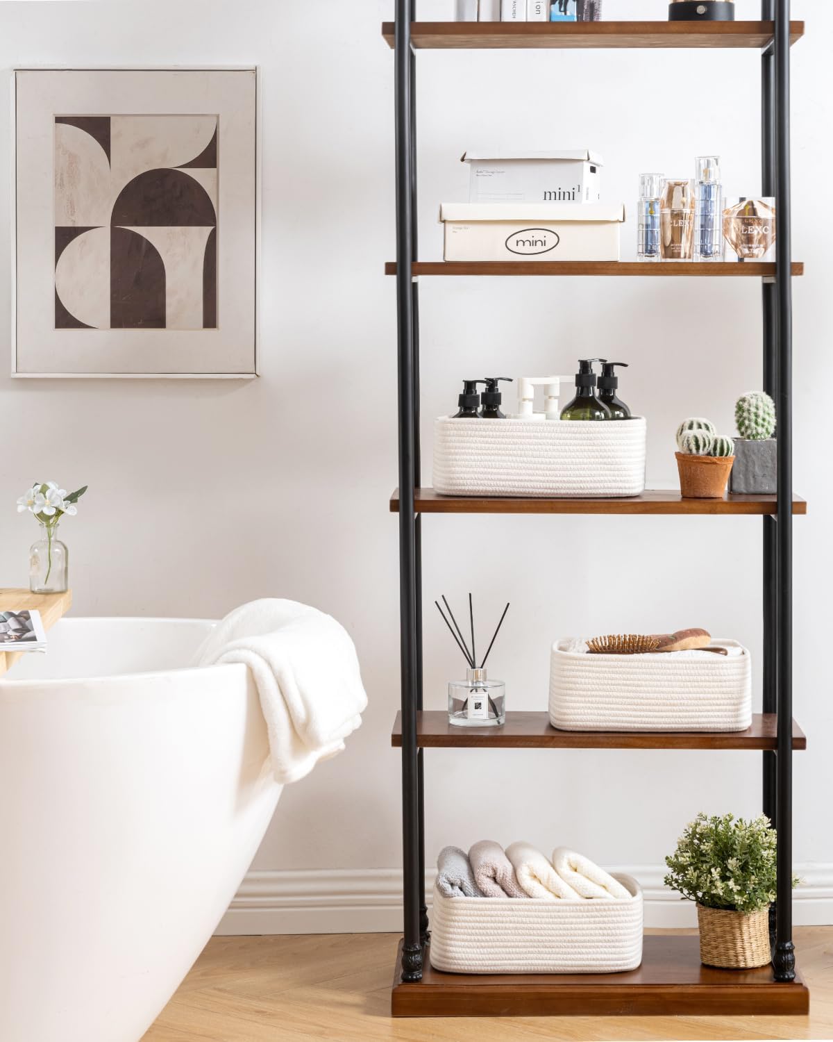 - [ Elegantly Designed to Match Any Dรฉcor ] Our small rope basket creates a minimalist appearance, and it adds a touch of warmth and texture to any room. The classic solid color design ensures seamless integration with your existing aesthetics, complementing any decoration. Perfect as decorative storage baskets for shelves, cabinets, and any open display space, making them a stylish and practical addition to any decor, enhancing the overall aesthetics of your room