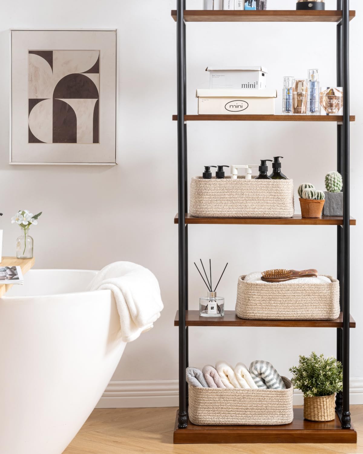 - [ Elegantly Designed to Match Any Dรฉcor ] Our small rope basket creates a minimalist appearance, and it adds a touch of warmth and texture to any room. The classic solid color design ensures seamless integration with your existing aesthetics, complementing any decoration. Perfect as decorative storage baskets for shelves, cabinets, and any open display space, making them a stylish and practical addition to any decor, enhancing the overall aesthetics of your room
