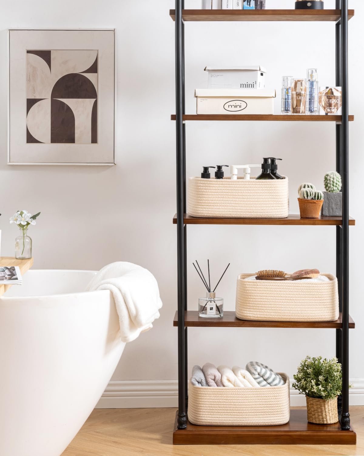 - [ Elegantly Designed to Match Any Dรฉcor ] Our small rope basket creates a minimalist appearance, and it adds a touch of warmth and texture to any room. The classic solid color design ensures seamless integration with your existing aesthetics, complementing any decoration. Perfect as decorative storage baskets for shelves, cabinets, and any open display space, making them a stylish and practical addition to any decor, enhancing the overall aesthetics of your room
