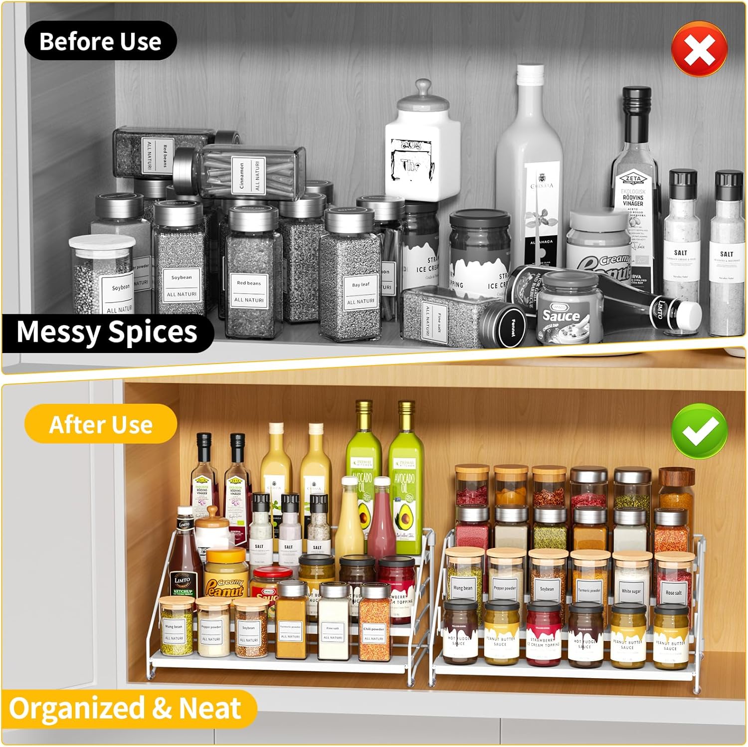 - 【Durable Metal,Strong And Sturdy】:The seasoning organizer rack made of high quality metal,sturdy frame and each tier has a sheet metal base design, provides spice bottles more stable to place and less to tip over. The surface of this cabinet organizer is smooth,with an anti-rust coating, and easy to clean with water or rag.