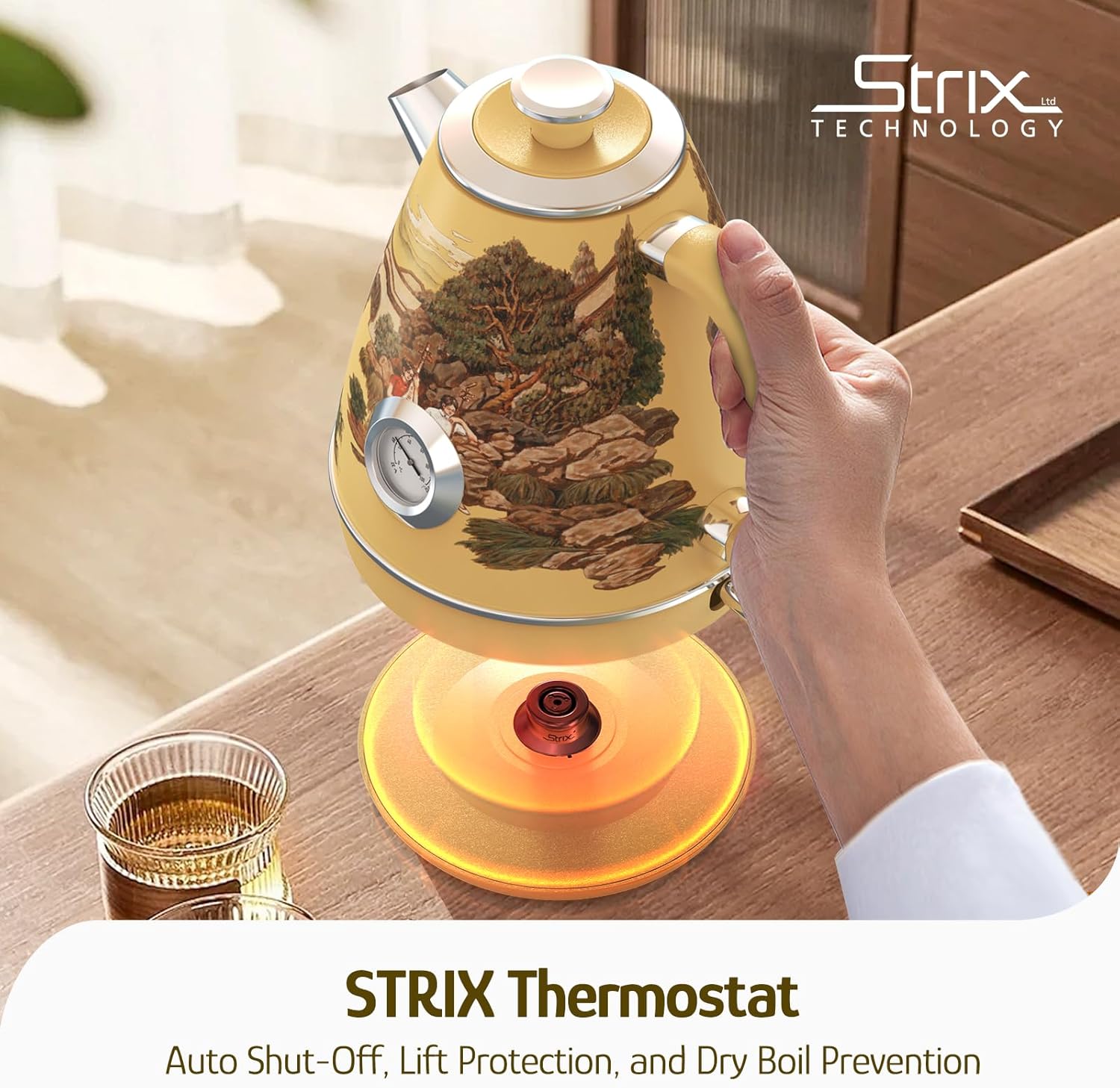 - Triple Security Guarantee: STRIX thermostat technology provides triple security for your use. Including 1-Auto shut-off when water begins to boil; 2-Auto shut-off when the kettle body is lifted from the base; 3-Prevent the kettle from turning on with no water inside.