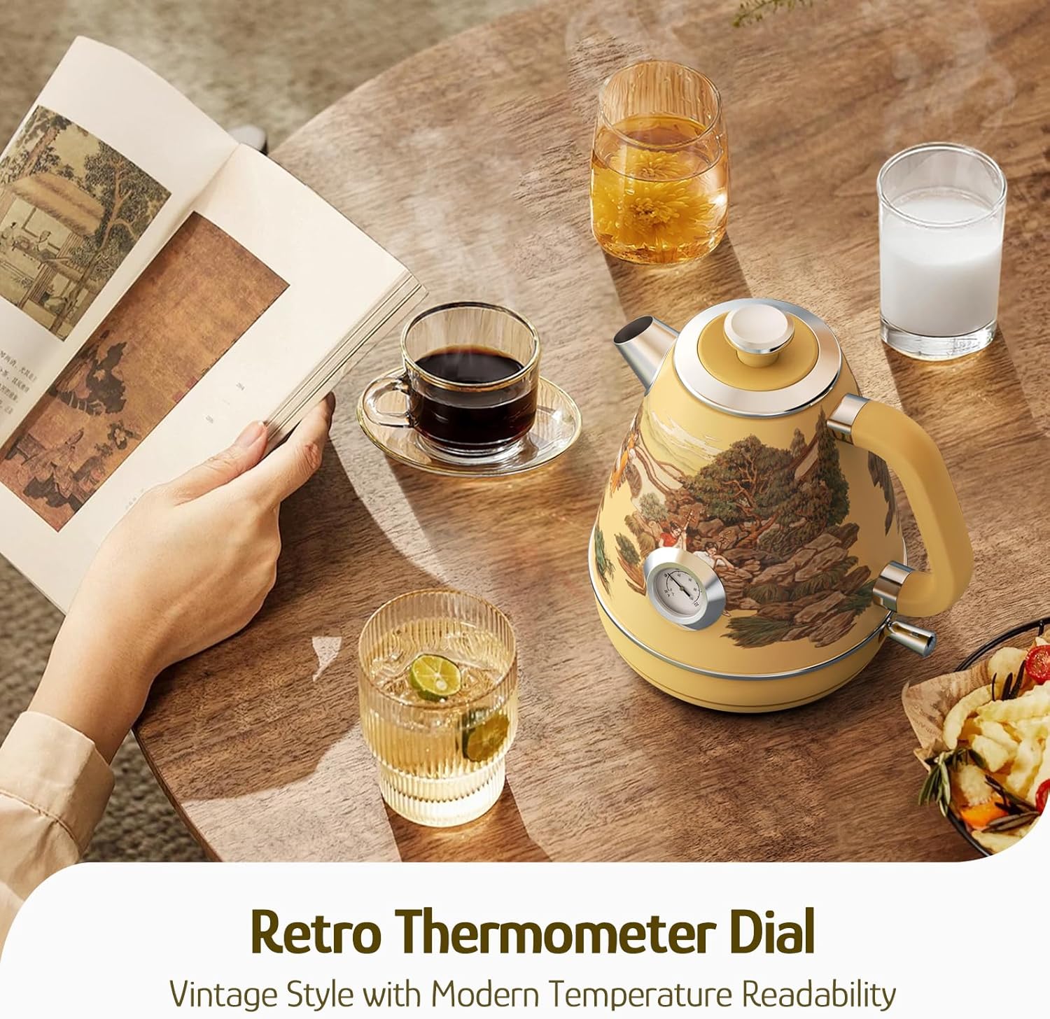 Hazel Quinn Retro Electric Kettle - 1.7 Liters / 57.5 Ounces Tea Kettle with Thermometer, All Stainless Steel, 1200 Watts Fast Boiling, BPA-free, Cordless, Automatic Shut Off - Garden Scenery