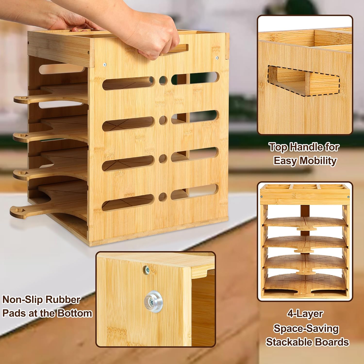 Pizza Peel Rack Stand Wooden, 4 Pack of 12 Inch Pizza Peels Wood Non-Stick, Pizza Peel Rack Holder with Top Storage Free Container Divider, Cutting Grooves for Easy Pizza and Bread Making