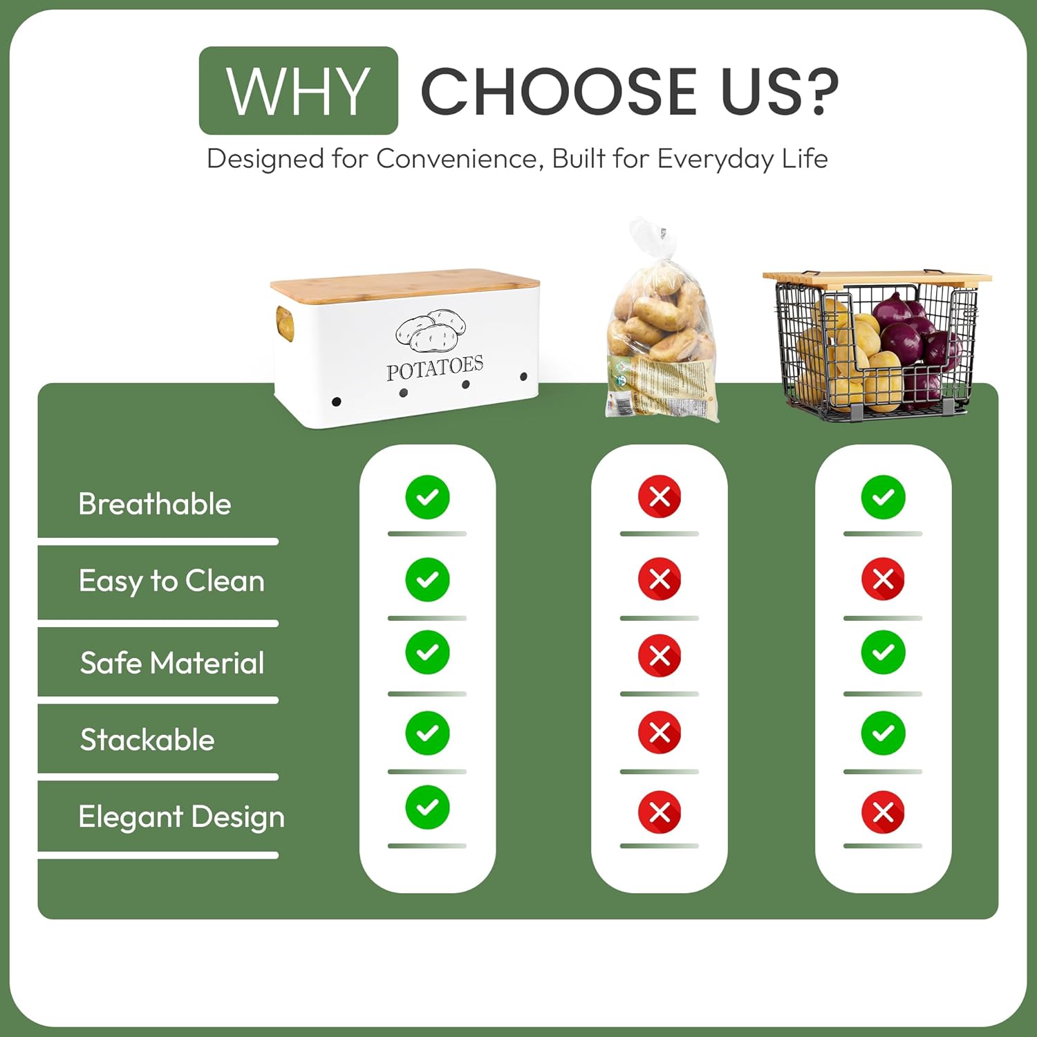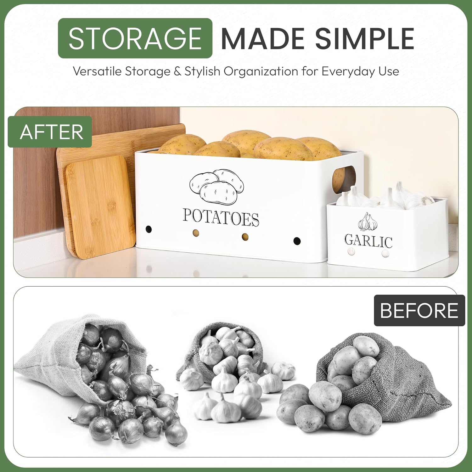 - VEGETABLE STORAGE SET onion garlic potato storage bins help you to remove clutters from your kitchen to maintain a clean countertop and keep your ingredients neatly organized with a touch of elegance and practicality.