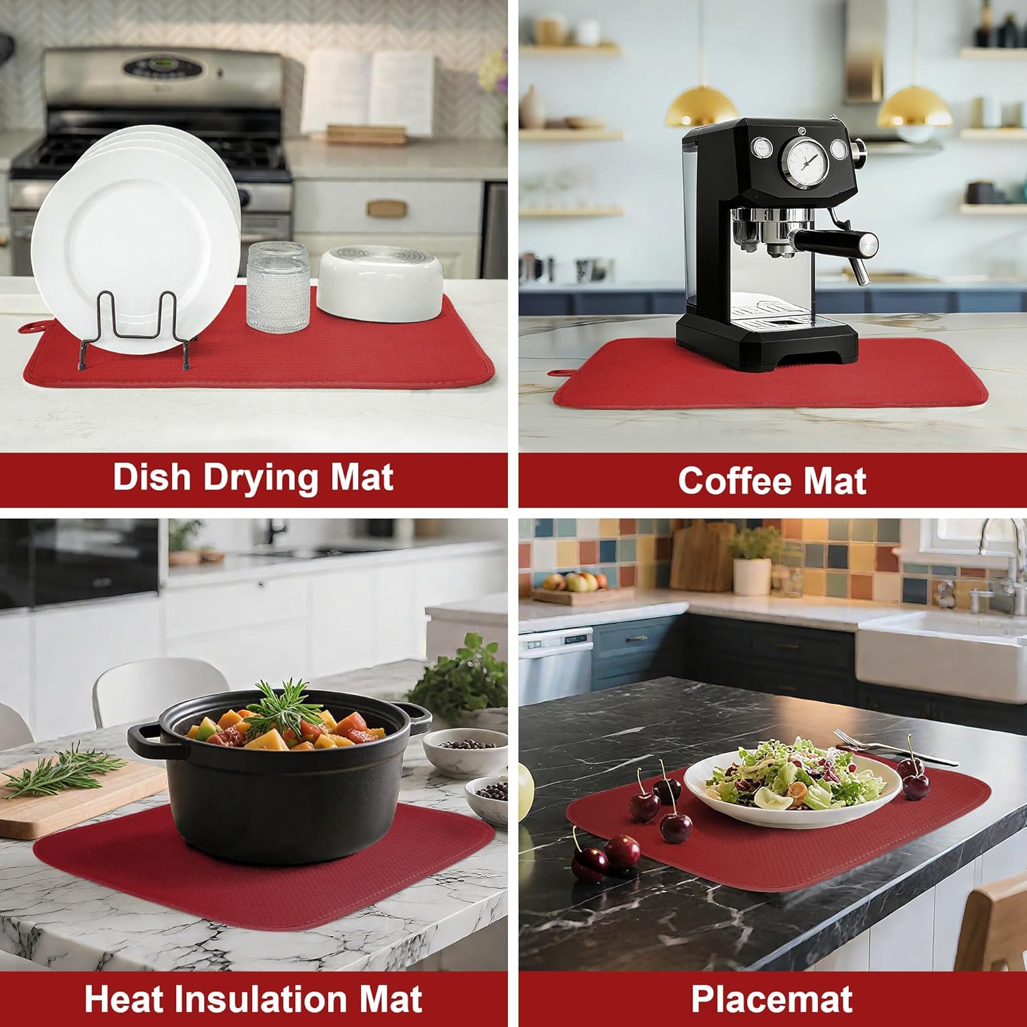 2 Pack Dish Drying Mat for Kitchen Counter, Super Absorbent & Anti-Slip, Machine Washable, 15" x 20" (Red)