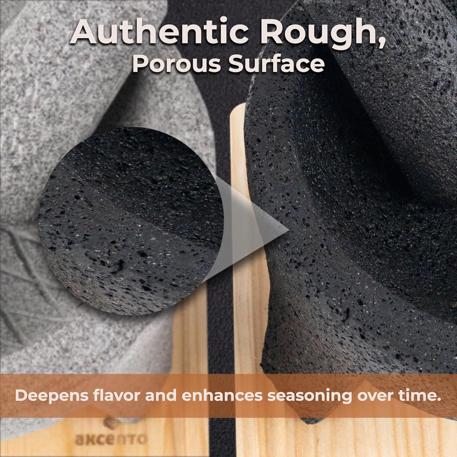 - š„ TWO VOLCANIC ROCK OPTIONS: Choose from our authentic black molcajete with a rough, porous surfaceāperfect for deepening flavor, enhancing seasoning, and grinding larger ingredientsāor our refined basalt lava rock grey molcajete with the grinding capabilities of a real molcajete plus a less porous finish, ideal for achieving a fine, uniform grind with smaller ingredients as a mortar; both deliver exceptional heat retention and superior grinding for true traditional flavor.