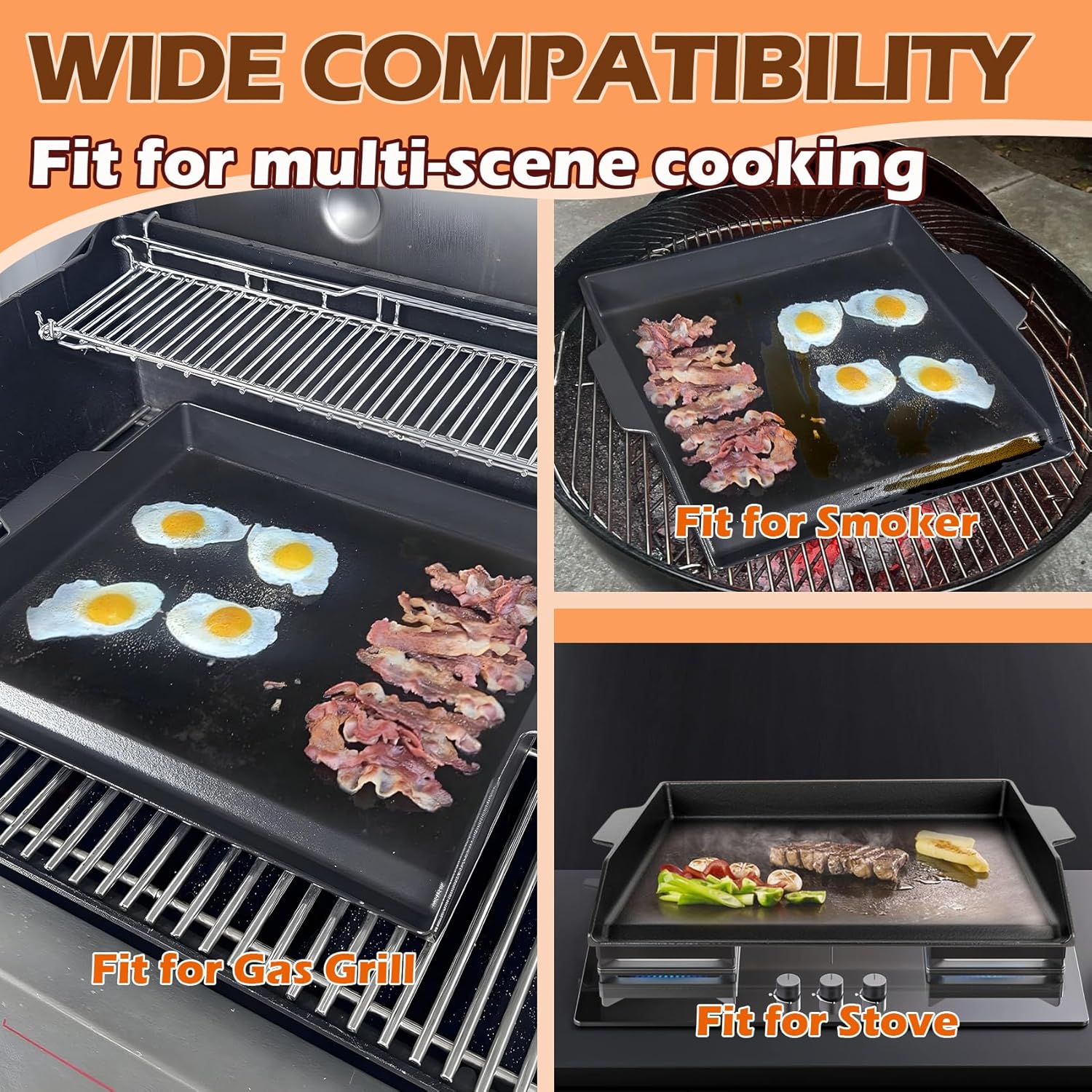 - FOR VERSATILE COOKING:Versatile cooking made easy with our cast iron griddle top for gas grill, Whether you're pancakes, juicy burger, bacon, cheese sandwiches vegetables or frittatas, large patties, seafood, this griddle pan will take care of all your cooking needs from morning to night! It also equipped with sturdy side handles, which make it easy to take and place, allows you to unlock various cuisines like a professional chef!