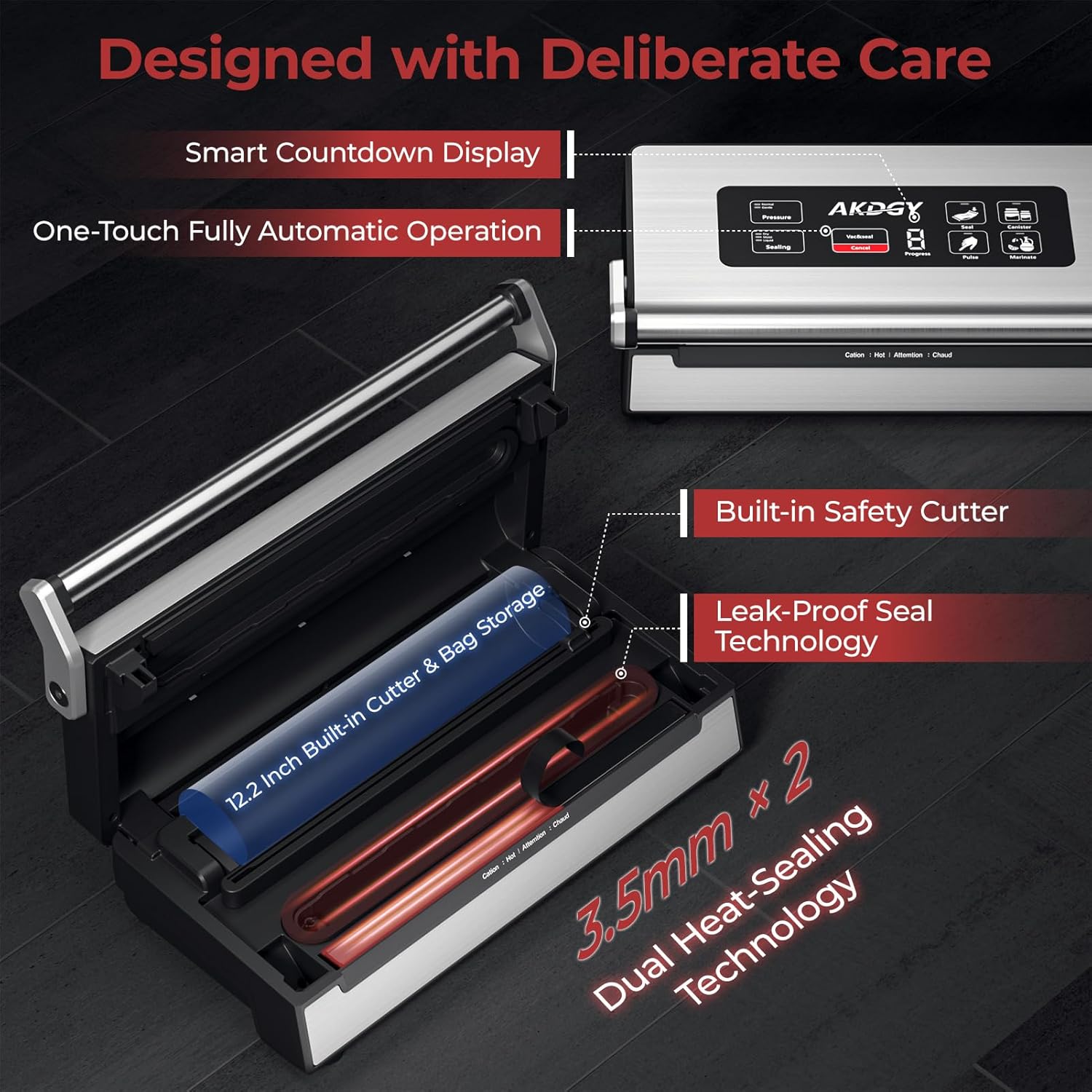- Built-In Roll Storage and Bag Cutter: 12.2" built-in bag roll storage conveniently stores various vacuum seal bag rolls (≤30cm) neatly in the machine. 11.8" integrated bag cutter can easily customize the bag size according to your needs. It comes with an integrated vacuum hose. There is no need to install it separately. Food saver vacuum sealer machine stainless steel surface removable vacuum tank, easy to clean and maintain