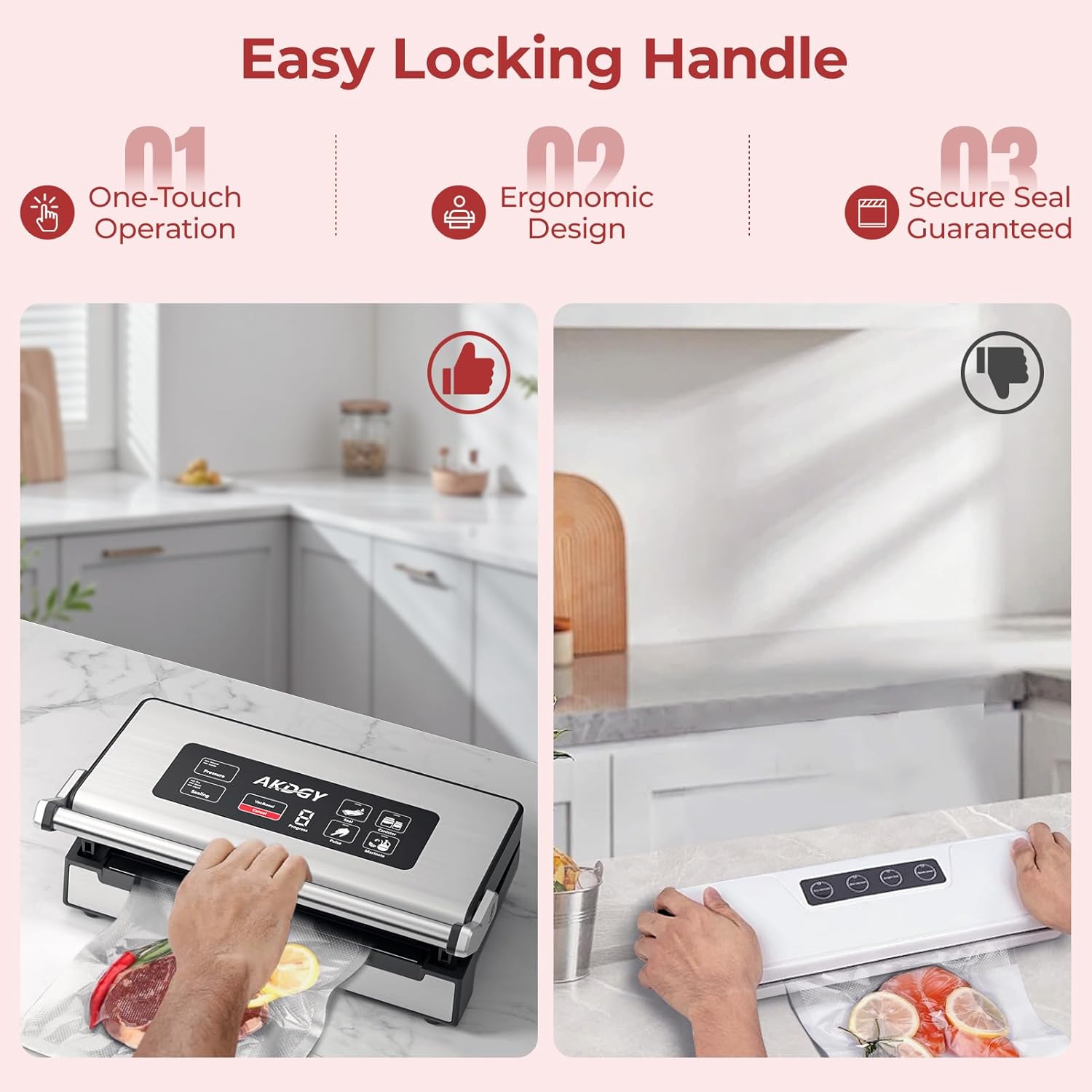 - Easy-Lock Handle and Digital Countdown: The patented handle design can be operated with one hand—no press hard need, it is easy to lock and ensure a tight and reliable seal. The vacuum sealer for food has an smart countdown function, and the LED digital display shows the progress in real time, gives a user-friendly experience