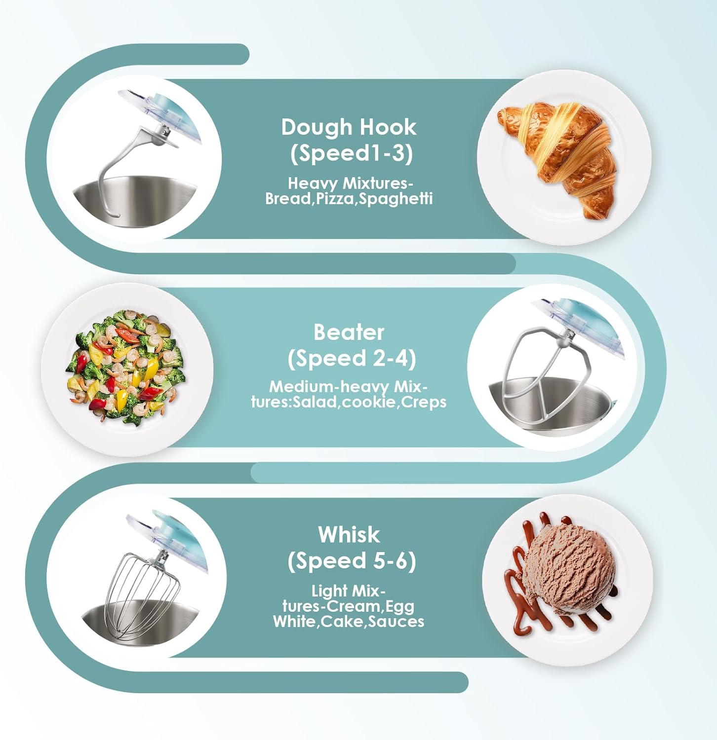 - Large Capacity 6.5 QT Stainless Steel Bowl - Our Household Stand Mixer ideal for family gatherings or hosting friends, meet needs of 2 - 6 people. Ideal for everyday baking, the kitchen mixer making it a reliable choice for making everything from bread dough to cake batter. Easy clean by Dishwasher.