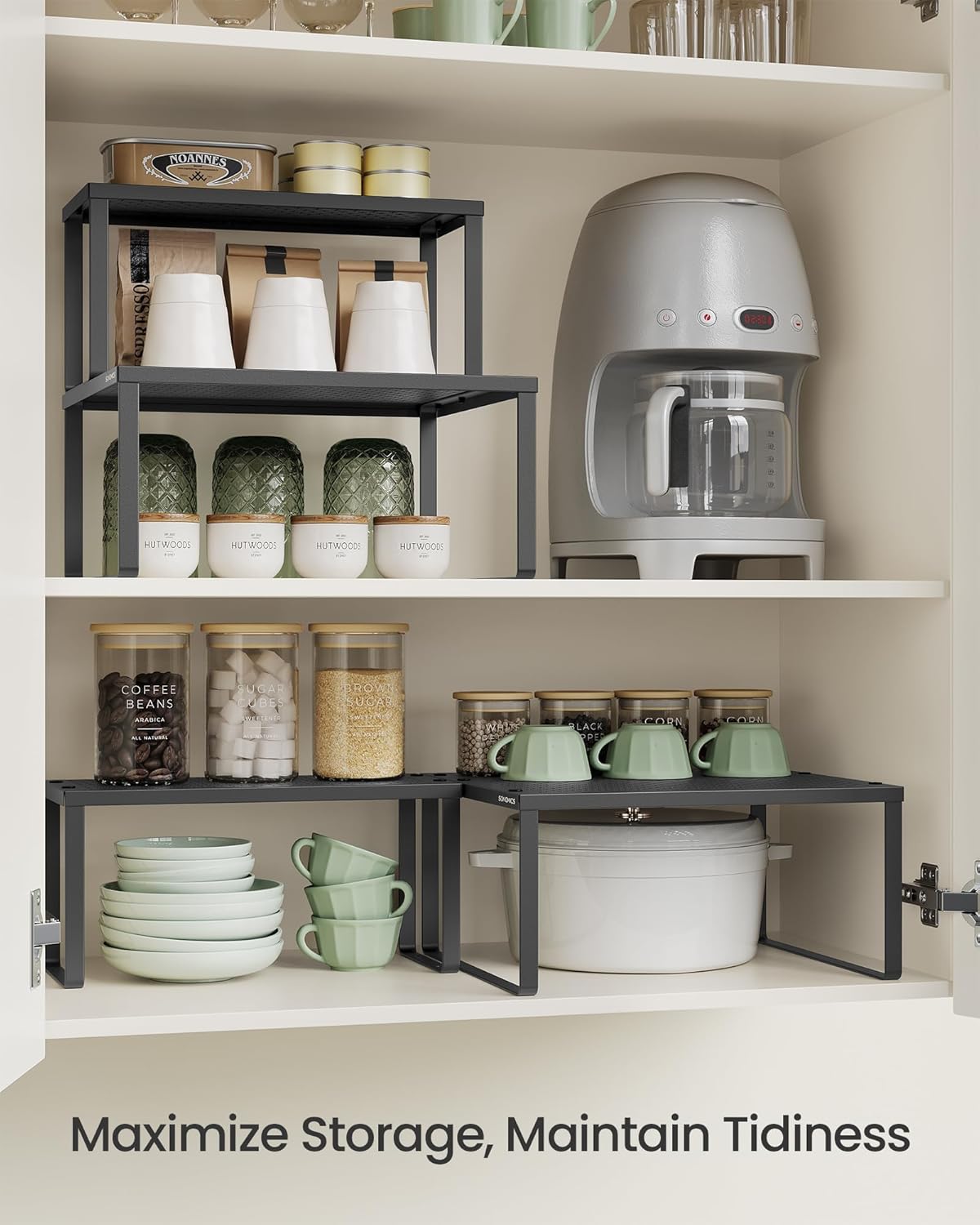 SONGMICS Spice Racks, Set of 2 Metal Cabinet Shelf Organizers, Countertop Organizers, Shelf Risers, Stackable, Expandable, Ink Black UKCS005B01