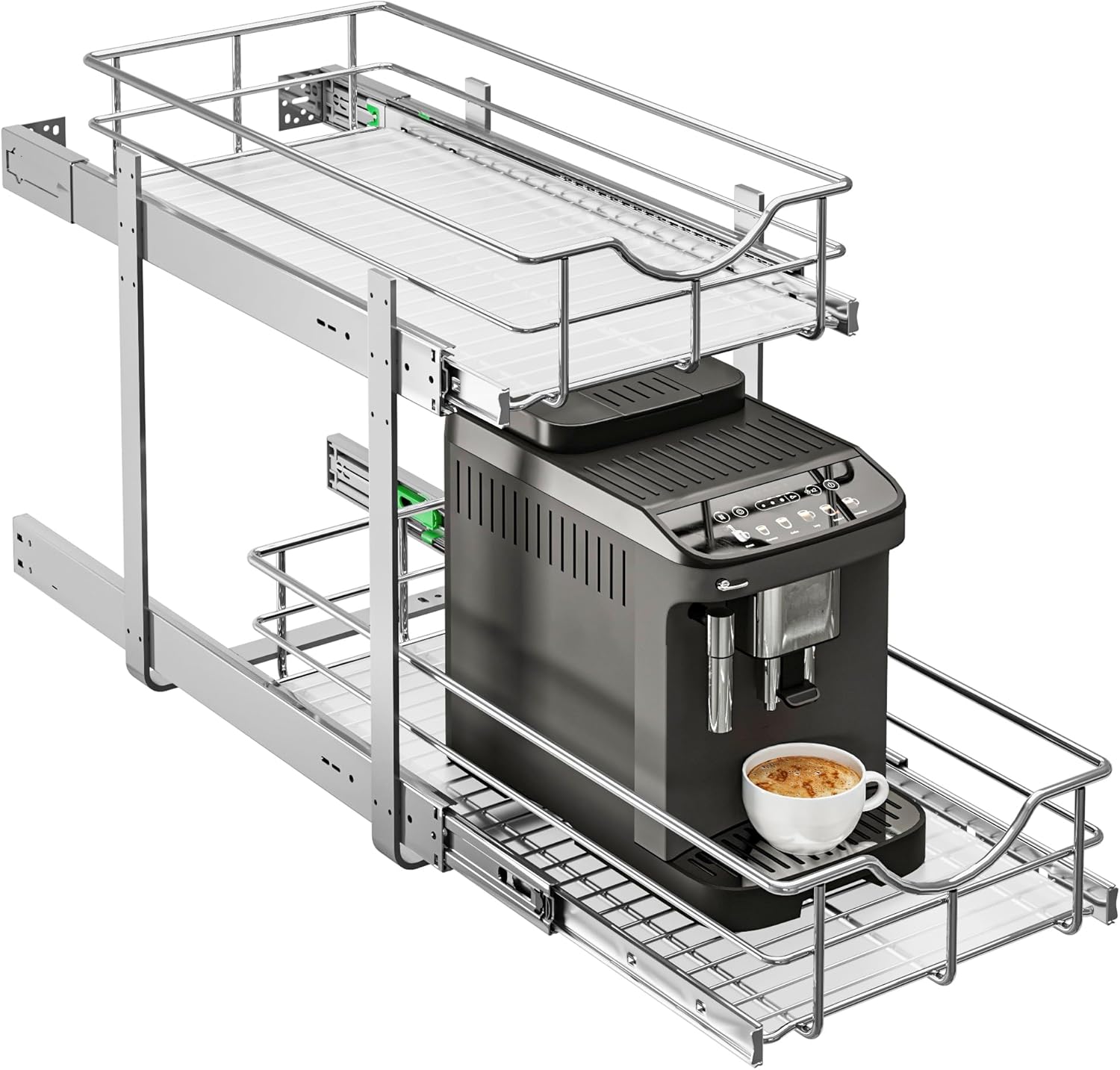 WelFurGeer 2-Tier Stainless Steel Pull Out Cabinet Organizer, Soft Close Damping Slides, Heavy Duty Chrome Plated Wire Basket with Shelf Liner, Perfect for Kitchen Cabinets, Pantry Storage, Under Sink