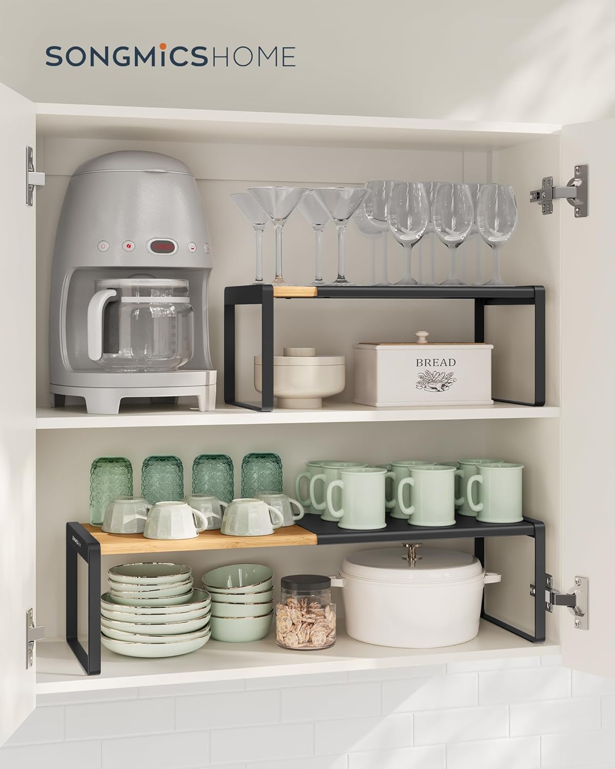 SONGMICS HOME Spice Racks, Expandable Cupboard Shelf Orgnizers, Kitchen Counter Shelves, Bamboo and Metal, Space-Saving Shelving, Stackable, Light Bamboo and Ink Black UKCS051B01