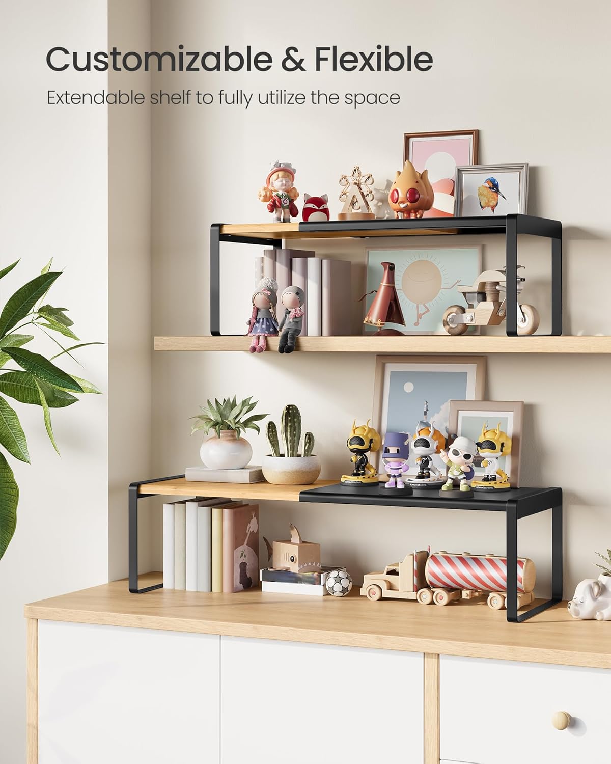 - 【STURDY CONSTRUCTION】Constructed with bamboo and steel, each cupboard organizer shelf is sturdy enough to hold up to 46.3 lb of kitchen utensils, ranging from spice bottles to toasters