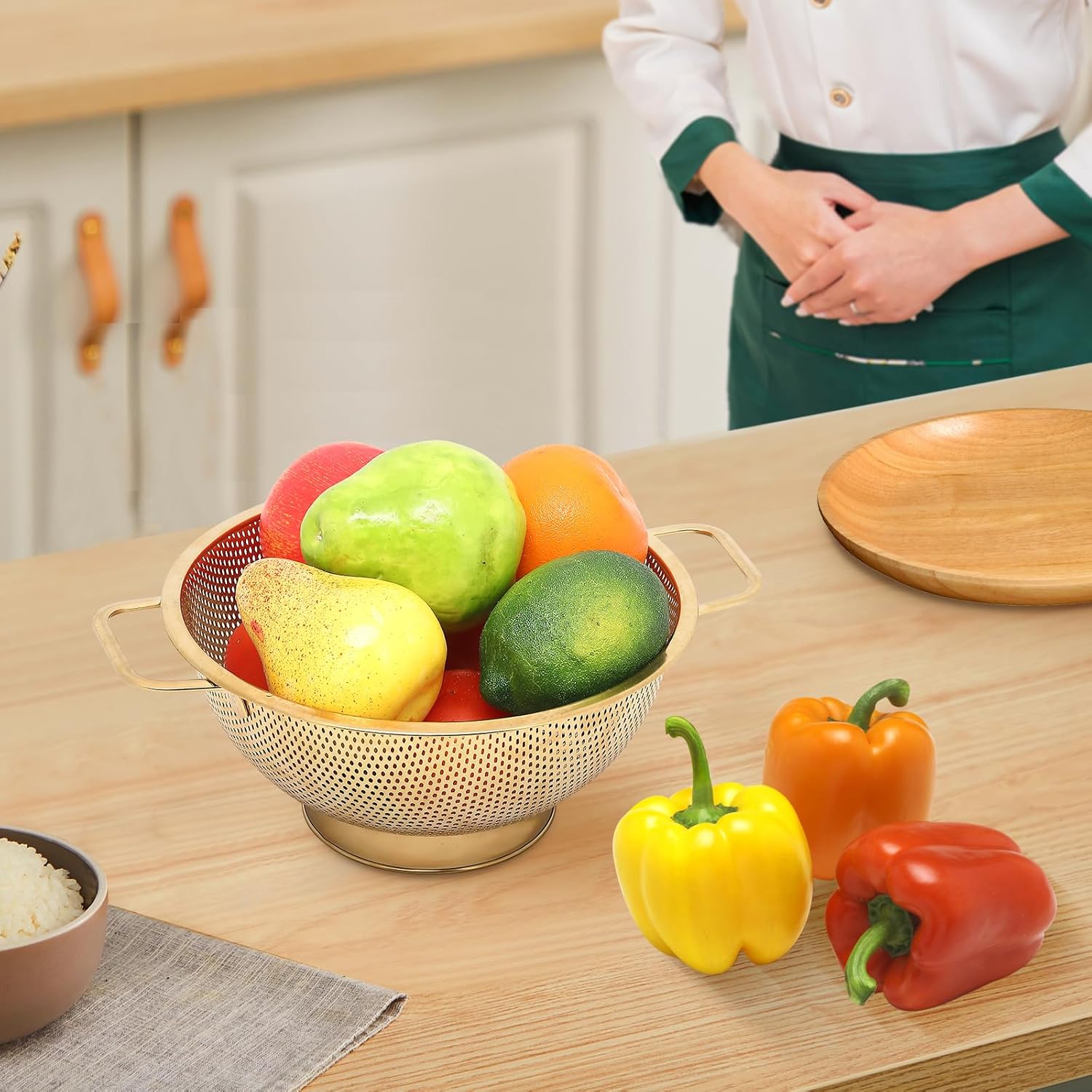 Gold Strainer for Kitchen, 3QT, Stainless Steel Colander with Handle for Fruits Vegetables Cooking Food, Dishwasher Safe