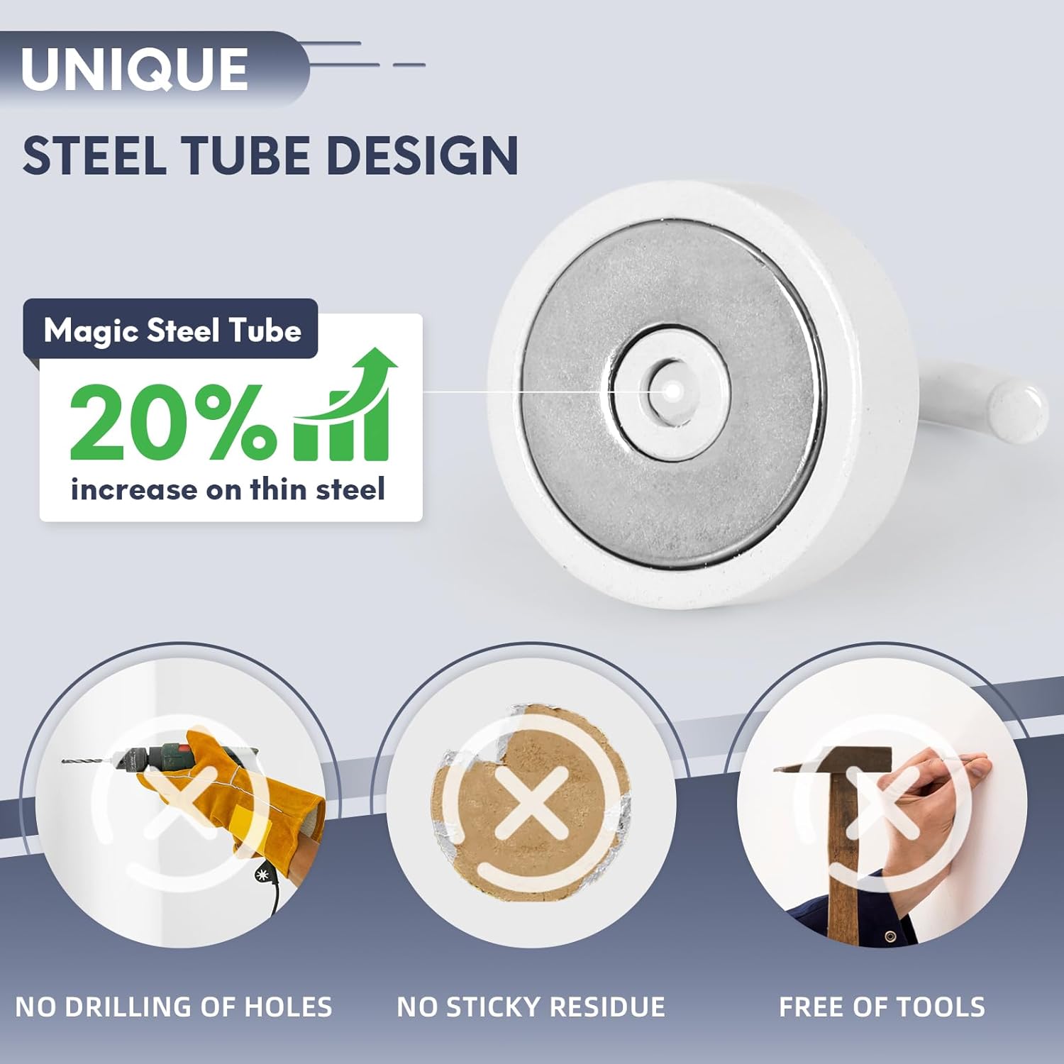 - ✔MAGIC STEEL TUBE DESIGN - Unique design of steel tube inside the base of magnetic hooks greatly increases the attractive force , especially on thin steel! It increase approximately 20% force comparing those none-tube magnets. it solves the problem of weak force on thin steel. Permanent magnetic hook with magic steel tube, strong magnetism lasts forever!