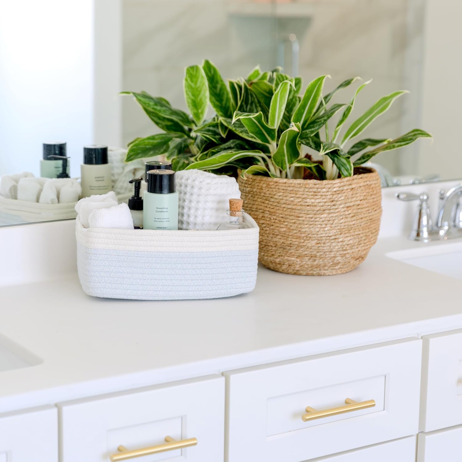 - Safe, Natural Cotton Organizer Bins: Crafted from the highest quality material in the market, our storage bins are oh-so-sturdy (and cute) and ready to take on little humans. They’re 100% safe, so you can rest easy if teething toddlers take a nibble. Reinforced Hidden Handles: Now you see ‘em, now you don’t! With completely hidden handles that blend seamlessly into the rope basket, you’ll be the Houdini of home organizing. They’re even double-stitched and reinforced for extra heavy loads!