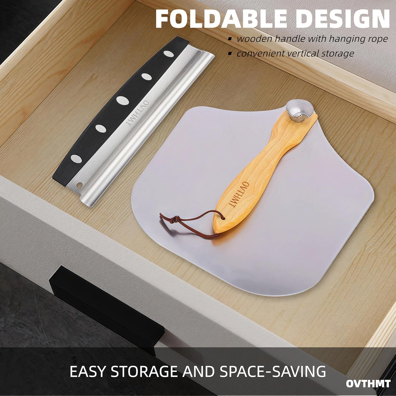 - PREMIUM DESIGN: The metal pizza paddle is 1.5mm thick and weights 1.15lbs. The foldable design wooden handle ensures space-saving storage, while the built-in hole with a hanging rope enables vertical placement.