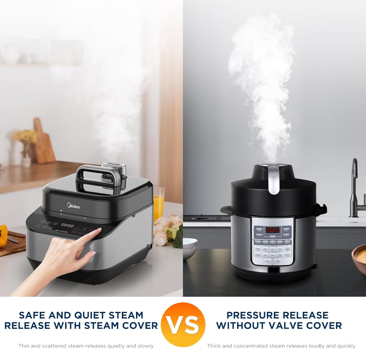 - ABUNDANT ACCESSORIES: Midea Pressure cooker comes with 6 helpful components: Spoon*1, Ladel*1, Condensation Cup*1, Measuring Cup*1, Steam Rack*1, Power cord*1.