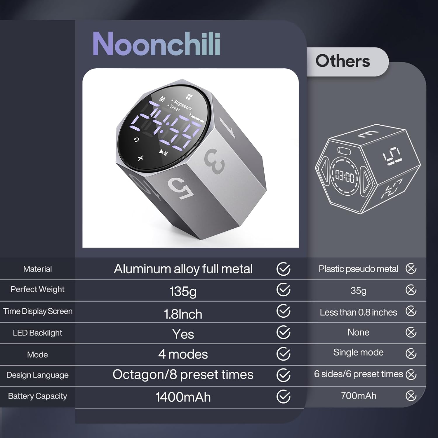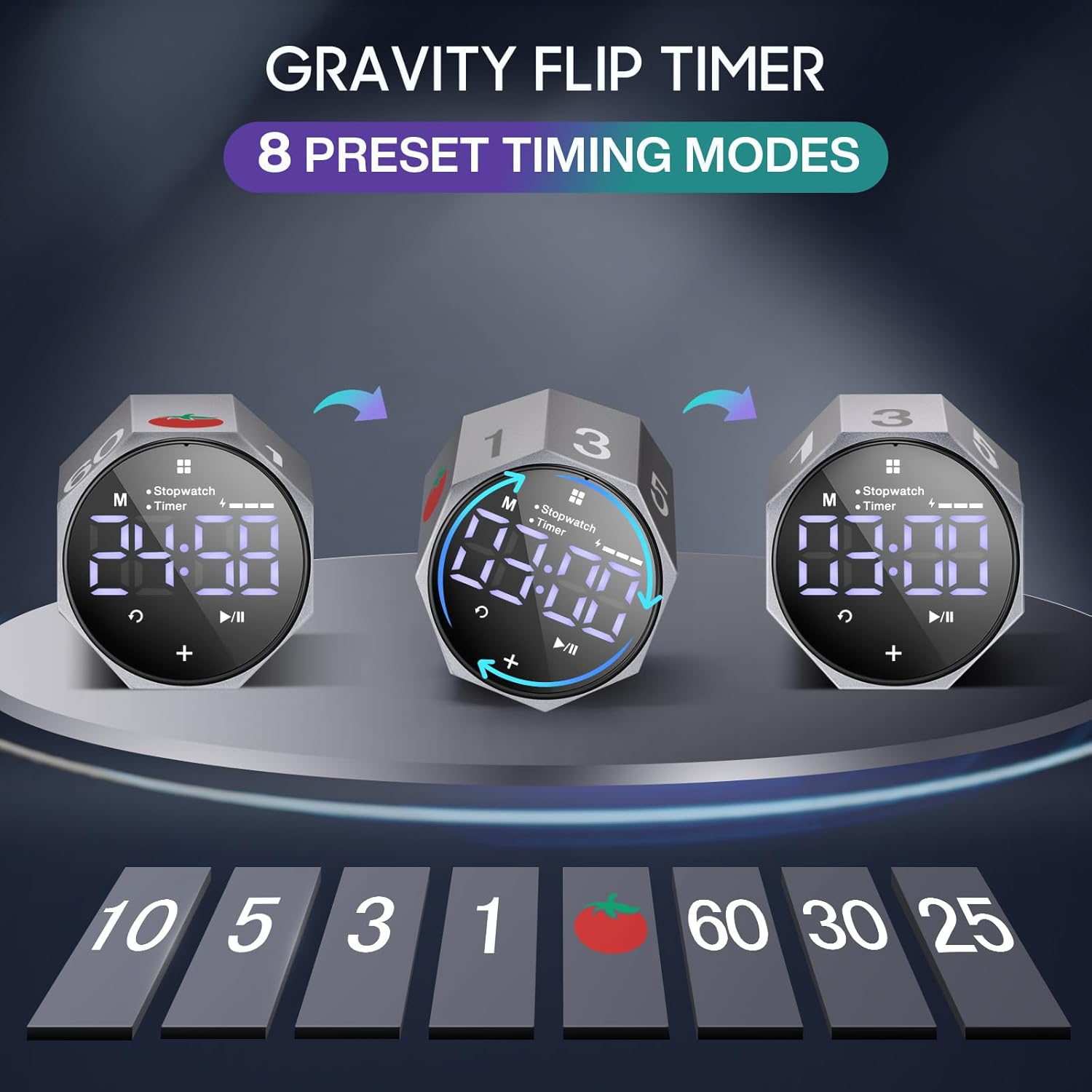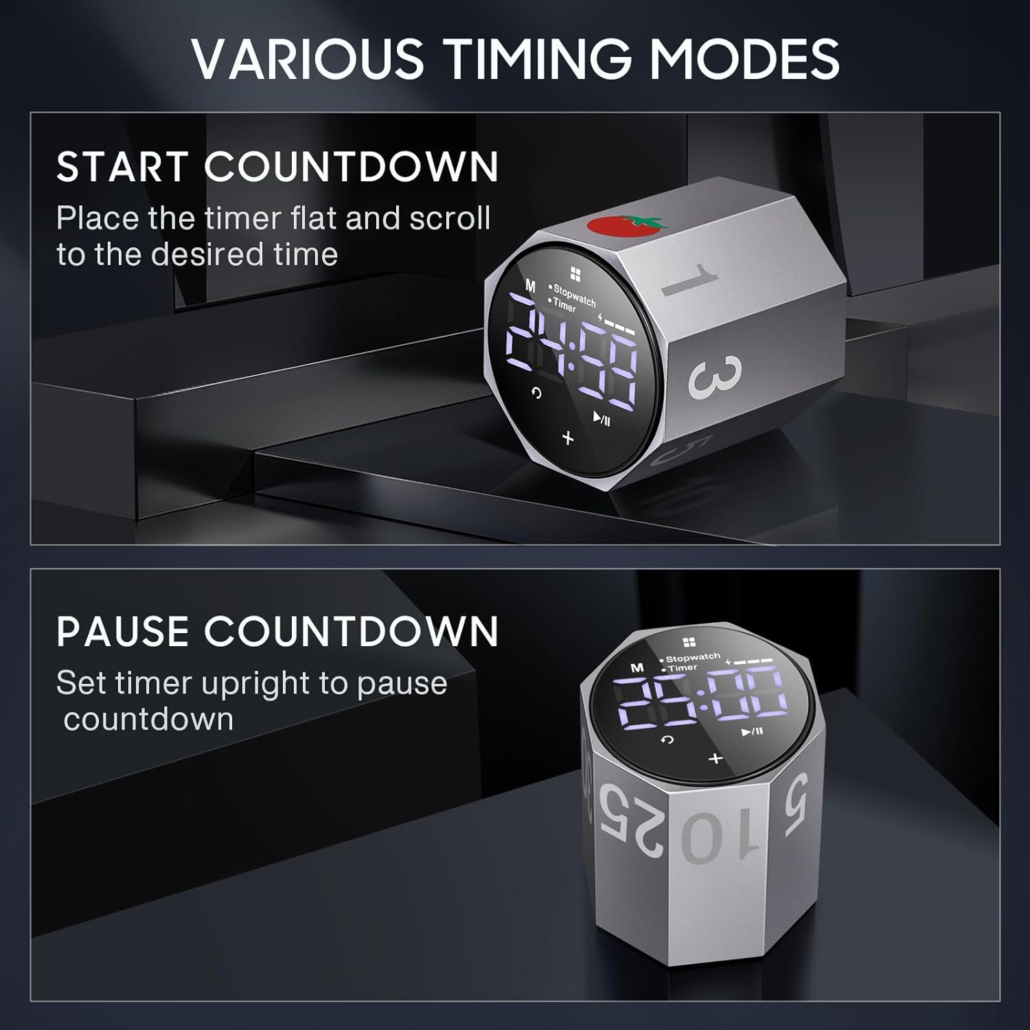 Digital Pomodoro Timer,Frosted Metal Productivity Cube Timer,1.8 in LED Digital Large Screen and Auto-Rotating Display,1/3/5/10/25/30/60min & Custom Time, Silent & Alarm,for Office, Study, Work(Grey)