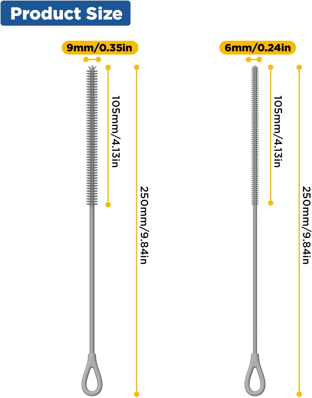 - >Multi Size: The set includes two diameters silicone straw brush, the length is 250mm, the diameters are 6mm and 9mm, and the brush head part is lengthened to 100mm, due to its extra long and soft design, it can easily brush the bottom of all kinds of straws, and it can clean every part of the straws to achieve a thorough cleaning effect.