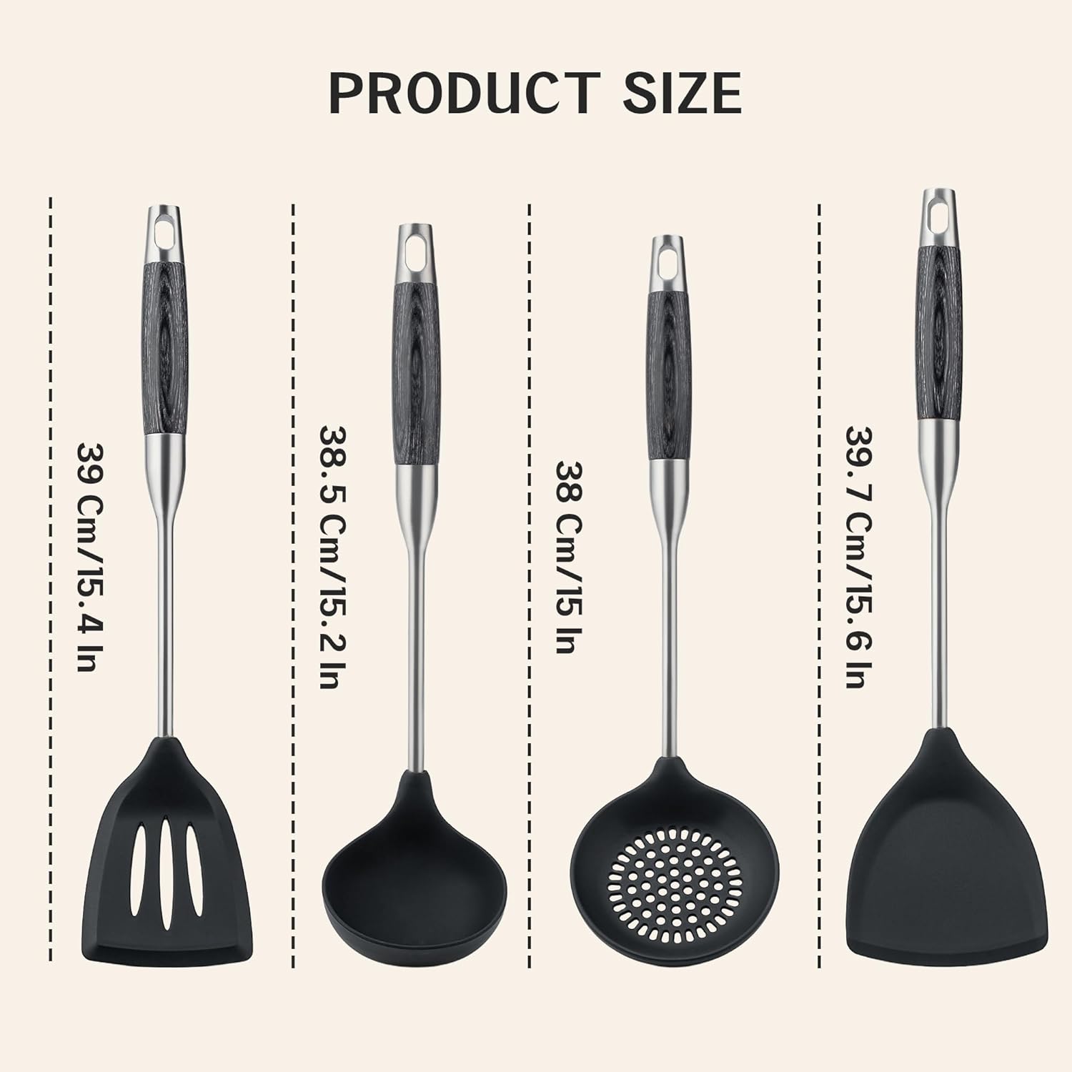 - Product Dimensions: spatula length:15.6",ladle length:15.2,skimmer ladle length:15.0",slotted spatula length:15.4"