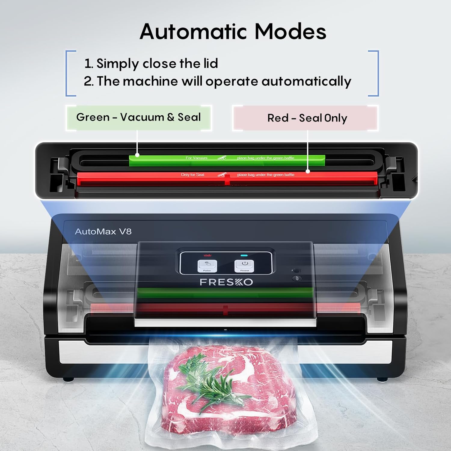 - 【Effortless Operation】‘Vacuum & Seal' mode (no button needed): Place the bag opening under the Green baffle & close the lid; 'Seal' mode (no button needed): Red baffle & close the lid; 'Pulse' mode: Freely control the vacuum degree - ideal for easily - deformed food; 'External' mode: Vacuum jars, sous vide bags, containers or wine plug; Auto Locking system: One-handed lid opening & closing - no need for extra pressing