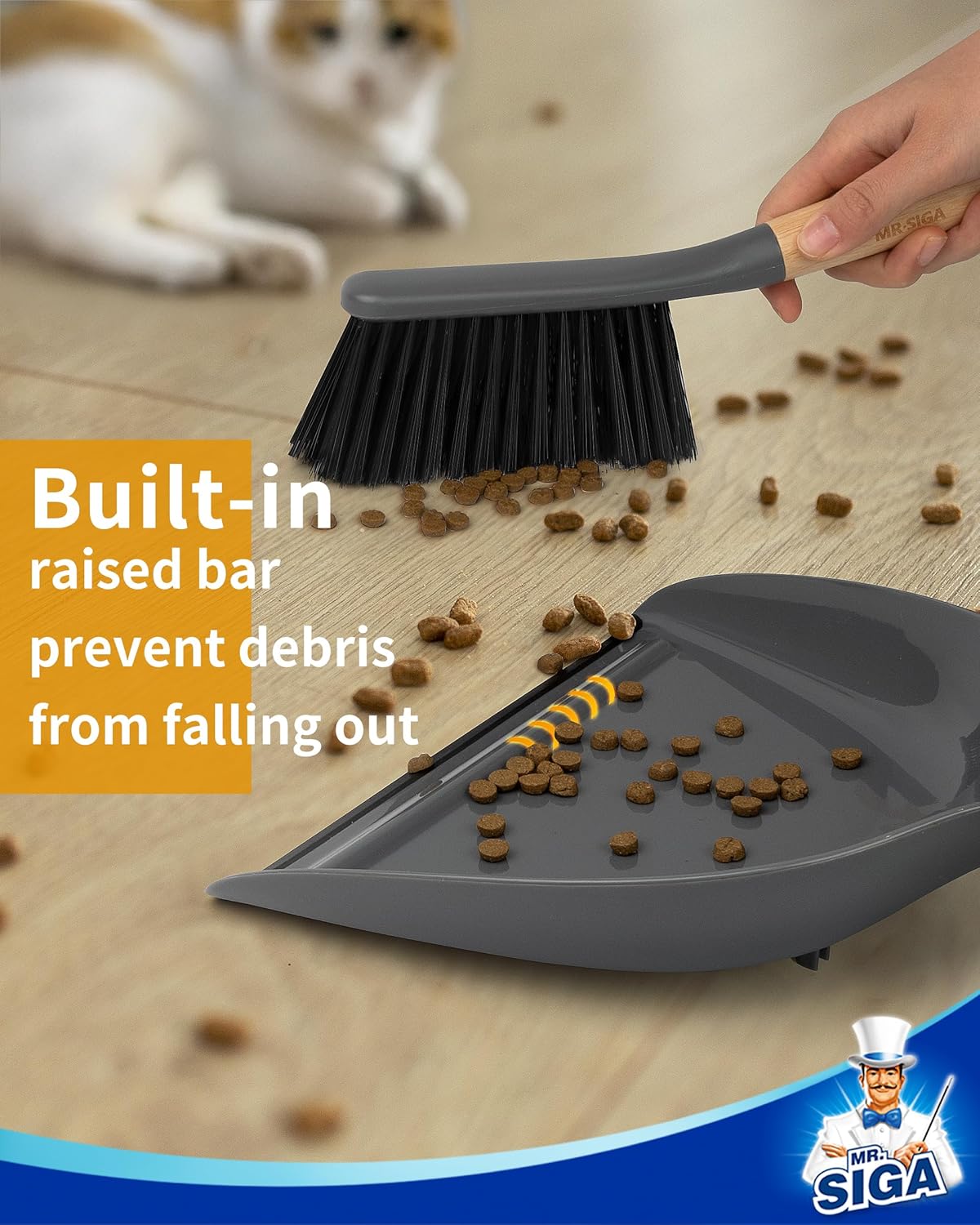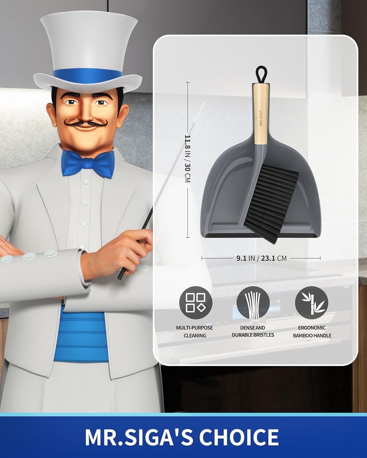 - Elegant and compact design. MR.SIGA handheld dustpan and brush set has a natural bamboo handle, its portable design makes it easy to carry and store, ideal for quick clean-ups anywhere in the home or office. Measures 13 " x 9.2 "