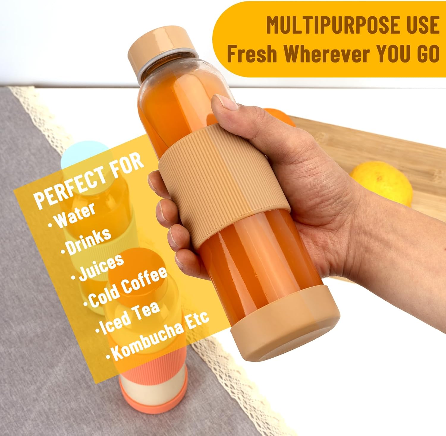 - AIRTIGHT,LEAK PROOF AND SILICONE SLEEVE: Each juice bottle comes with a stainless steel cap which is lined with a rubber O-ring, 100% leakproof. Their glass water bottle with silicone sleeve offers added protection and a comfortable grip