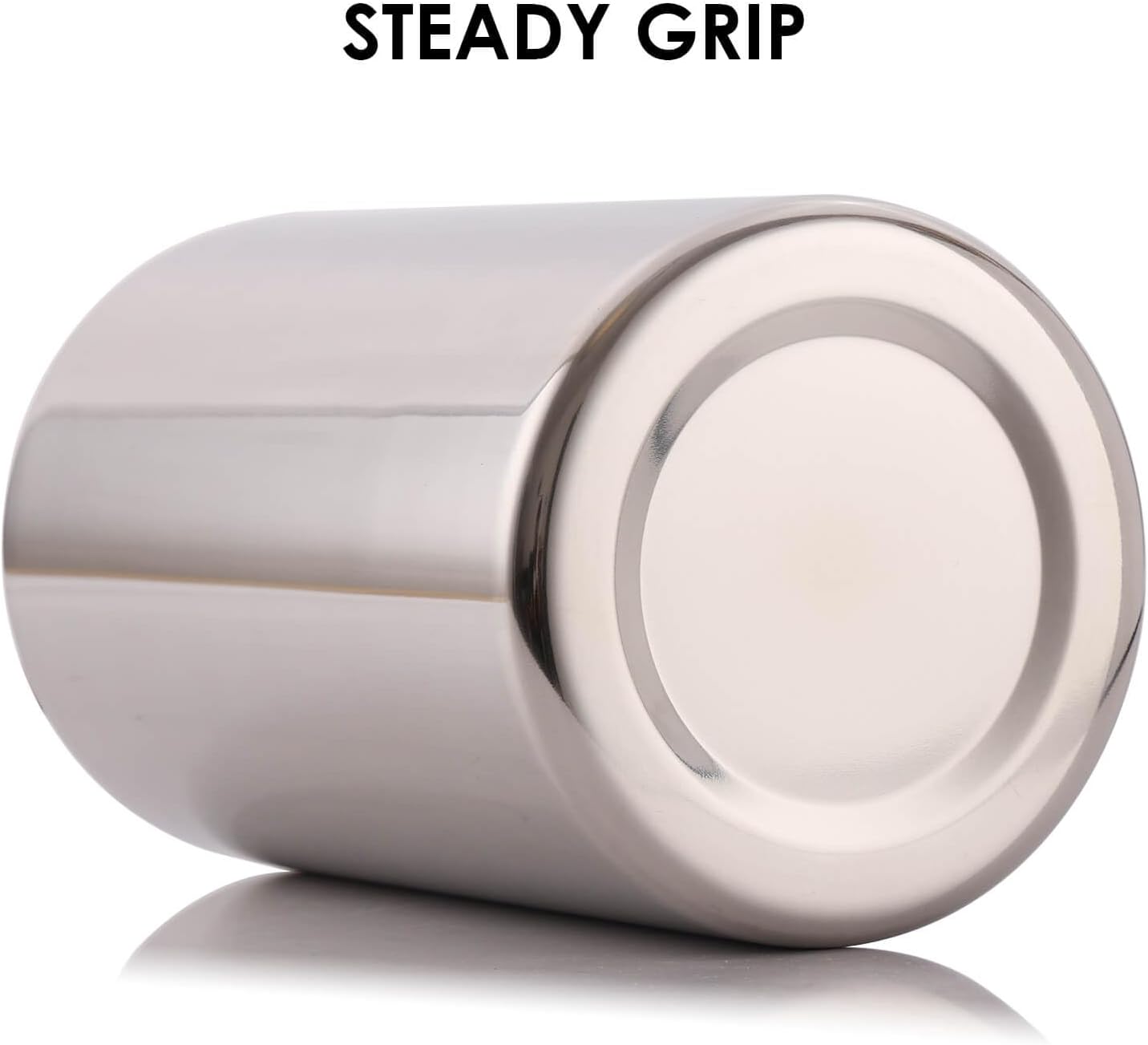 - Double wall stainless steel round storage bucket is large and tall body, 4.7" W x 7.5" H. Will sit firmly on countertop, conveniently access any and all kitchen utensils while cooking, serving, or grilling, wonβt slip, slide, or wobble